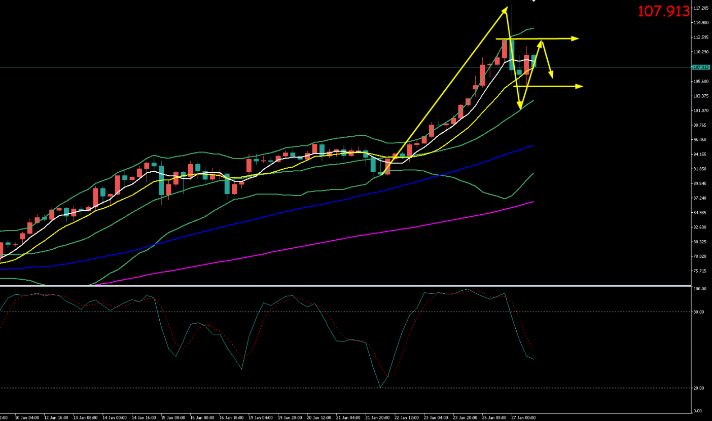 周二(1月27日)亚市,银价在历史峰值区域展开高位震荡。价格开盘于103.92美元/盎司附近,开盘后多空博弈激烈,价格围绕前一日收盘价上下波动。盘中最高上探至111.17美元/盎司附近,最低测试102.91美元/盎司。现货白银交投于107.9美元/盎司附近,
