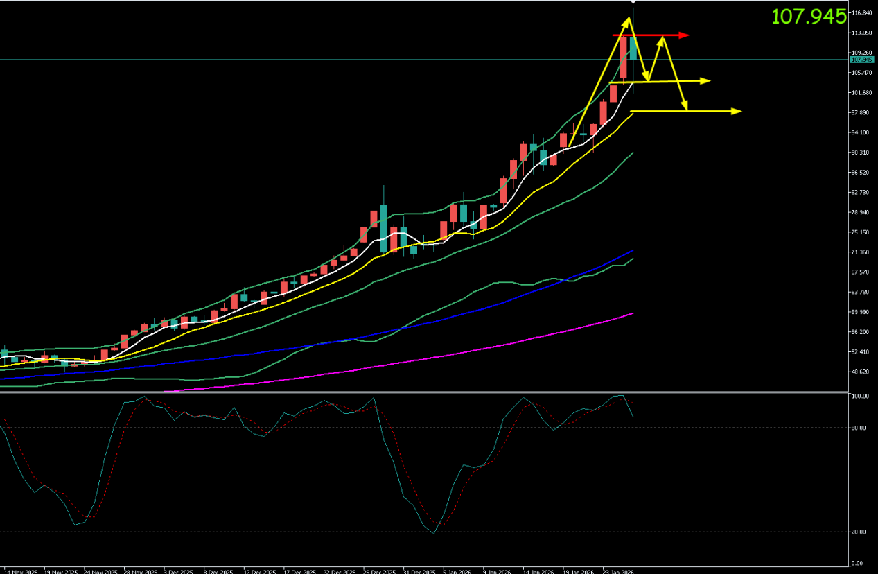 日线图显示,银价以连续数日近乎垂直的巨阳线完成加速冲顶,上升趋势的斜率已达到极端水平。市场完全由多头情绪主导,但所有常规摆动指标均已进入严重超买与钝化区域,技术性回调的风险急剧累积。当前,110美元已成为最新的关键心理关口。下方,前高突破区域105-107美元已转化为首个重要支撑带。