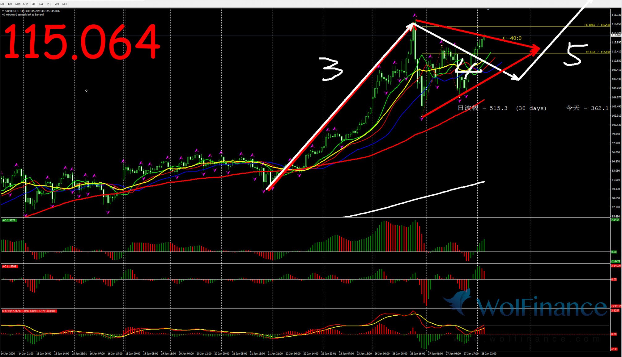 日线图目前处在3浪之中,关注3浪的行情走势。压力倾向在日线图117一线附近;支撑倾向在日线图50%(77.50)和61.8%(70.00)一线附近;四小时行情处在3浪走势;1小时图AO零轴下红色;AC零轴下绿色,行情在小时图356日线之上运行;小时图关注117附近的压力;所以今日关注1小时图震荡行情。