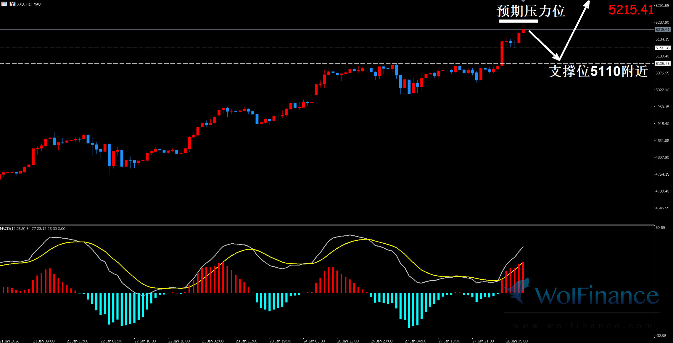 1. 黄金技术图表显示目前K线支撑位5110附近