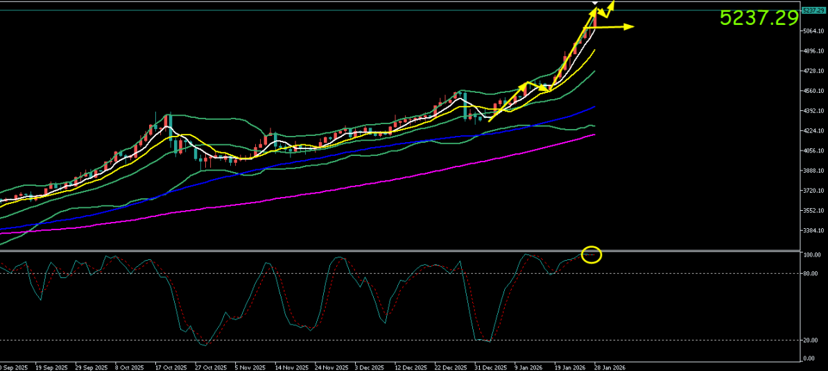 日线图显示,金价在历史性突破5000美元大关后,仅经历一日高位十字星整理,便以更陡峭的斜率重启升势,确认市场处于极端强势的主升浪阶段。目前价格已突破5200美元,正向上一个关键心理区域5400-5500美元迈进。然而,所有摆动指标均处于严重超买区域,尽管在强势趋势中可能钝化,但也预示着技术性回调的风险随时可能触发。下方,5100-5150美元区域已成为新的关键支撑平台。
