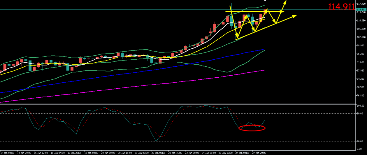 现货白银周二(1月27日)价格开盘于103.92美元/盎司后,最高触及113.57美元/盎司最低试探102.96,收盘于111.66美元/盎司附近。日线级别高位震荡。周三(1月28日)亚市,市场在经历了隔夜的史诗级震荡后,进入短暂喘息。银价开盘于111.94美元/盎司附近,开盘后价格并未深跌,而是在隔夜巨大波动区间的中上部展开高位盘整。盘中多头试图再次组织攻势,最高上探至115.4美元/盎司,最低回踩至110.53美元/盎司。现货白银交投于114.62美元/盎司附近,日内小幅上涨。市场在历史巅峰区域呈现出“跌不下去”的强势特征,但波动率已扩张至危险水平。