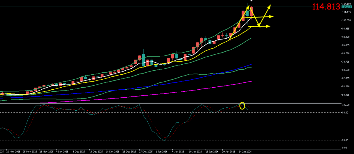 日线图显示,银价以连续数日惊心动魄的巨阳线完成加速,上升通道的斜率已陡峭到令人瞠目。昨日收出的史上最长上影线,明确揭示了117-120美元区域存在难以想象的史诗级抛压。这是一个强烈的单日反转警示信号。然而,价格今日并未崩潰,而是在昨日巨震区间上部强势整理,显示多头韧性依然极强。市场处于典型的“高空钢丝”状态:向下,110-112美元区域成为最新生命线;向上,118美元是必须攻克的天花板。所有技术指标均已失效,市场由情绪和资金博弈主宰。