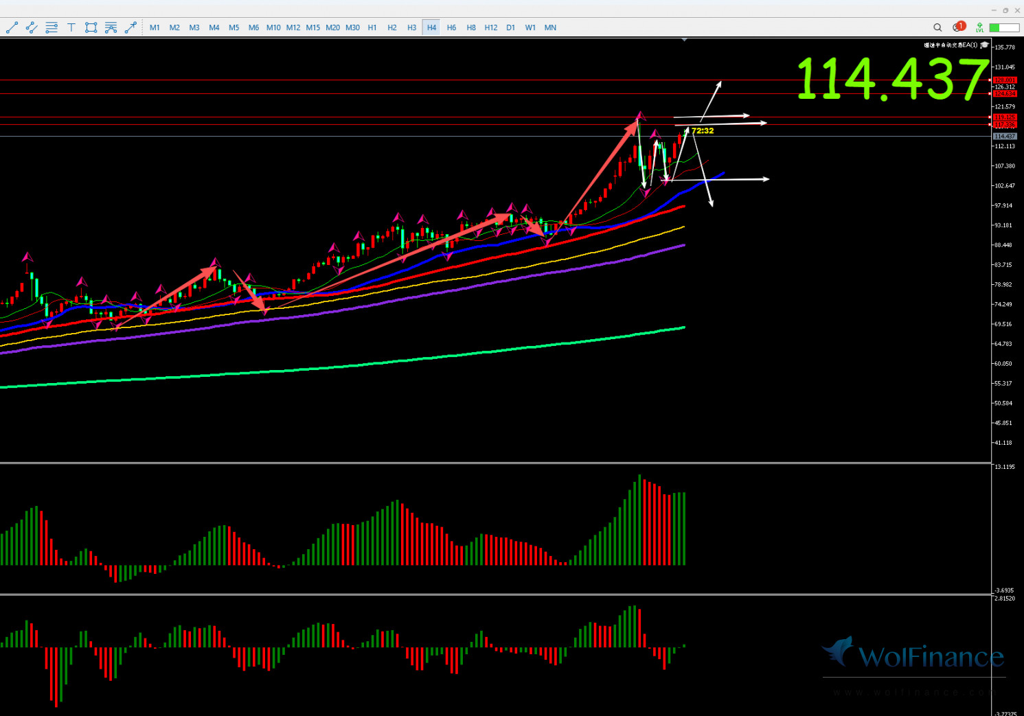 解析:日线AO绿色,AC红色,日线鳄鱼线缠绕;4小时AO绿色,AC绿色,鳄鱼线缠绕向上;银价自48.66涨至83.97后回落,目前最大回落至4小时的60均线后小幅反弹,银价自83.97下跌至4小时的60均线70.00附近判定1小时完成了完整的下跌ABC浪,是故自70.00反弹判定为2小时的反弹B浪或者是3小时的5浪预期,上周五银价自70.00上涨至74.51后下跌回补缺口后再次上涨至82.20附近,此段上涨判定为反弹B浪,之后银价自82.20回落至3小时的89均线附近此段下跌判定为2小时的下跌C浪,当下银价自73.80上涨至现在84.26附近,此段上涨判定为3小时和4小时的上涨5浪预期,70.05到82.20此段上涨判定为4小时的5-1浪,82.20下跌至73.80为下跌5-2浪,银价自73.80上涨判定为开启上涨上方关注107.07-111.92-116.98-121.29-124.76-125.85-134.26目标预期,银价自73.80上涨至95.84判定为5-3浪,之后调整至90.30上涨为5-4浪,银价处于自90.31上涨5-5-3浪中,银价冲击了116.96-121.29目标区间后冲高回落跌至30分钟的120后反弹,昨日银价反弹111.41后回落至30分钟的89均线后再次起涨,目前涨至前高117.66下方116.27后回落,由于金价未跌破1小时的60均线是故当下若银价冲高前高则判定1小时恢复上涨30分走5-3浪预期上方关注123.30-127.64-134.26-139.00预期,若冲不过前高则判定30分钟的B-c浪,则日内继续看银价回调C下方关注105.73及1小时的89-120均线及2小时的89-120均线支撑预期。
