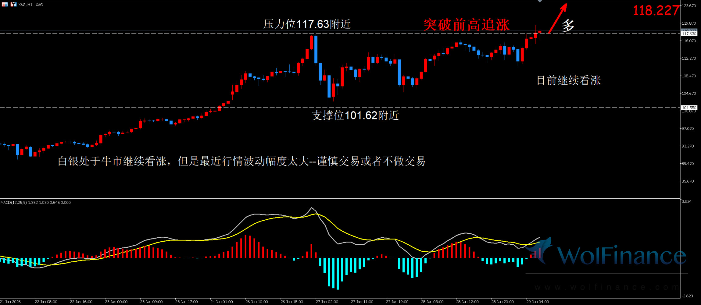 周四 (01月29日)白银早盘连续高位震荡反弹,突破考虑追涨布局方案,最新报117.38美元/盎司,避险情绪高涨:政治风云变幻:白银与铂金的同步狂欢:黄金暴涨现货白银也紧随其后,周三收涨4.22%至116.69美元,周四早盘截止08:00,最高触及119.24美元,再度刷新历史高点,涨幅约2.2%。白银今年以来涨幅逾60%,远超黄金,但渣打银行分析师在报告中警告,多项白银指标显示银价短期内可能面临回调。这表明贵金属市场整体处于高热状态,但银价的波动性可能更大,投资者需警惕潜在调整。地缘政治风暴:美伊冲突升级成金价最大推手地缘政治紧张无疑是本轮金价暴涨的核心驱动力,特别是美国与伊朗之间的剑拔弩张,让市场充斥着战争阴霾。担忧美国打击伊朗的传闻不断发酵,推动避险买盘持续涌入。