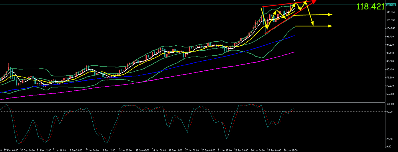 现货白银周三(1月28日)高位盘整后,于纽约时段再度向上突破。价格开盘于111.94美元/盎司,盘中震荡上行,最高触及117.63美元/盎司,最低回踩110.53美元/盎司,最终收盘于116.8美元/盎司附近,日线收阳。