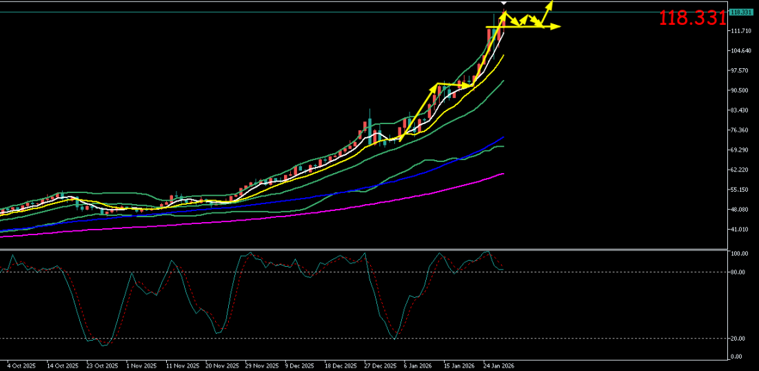 日线图显示,银价以连续大阳线彻底摆脱了前期的震荡平台,上升趋势进入新的加速阶段。价格已突破118美元关键阻力,市场处于典型的情绪驱动型逼空行情中,“无阻力”上涨特征明显。然而,价格的垂直拉升使得所有摆动指标进入极端超买区域,技术性回调的风险与涨幅成正比急剧放大。下方,115-116美元区域已转化为最新的密集支撑区。