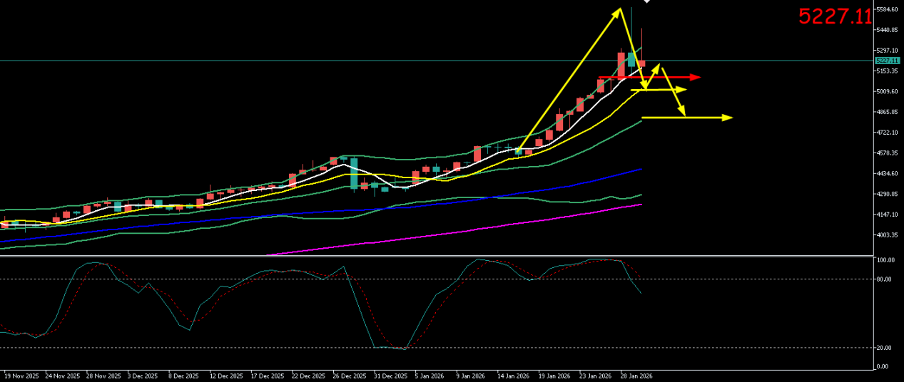日线图显示,金价在创下历史新高后,收出经典的“单日反转”巨阴线,这是一个强烈的短期顶部确认信号。一日内超过500美元的震幅,彻底打破了前期的单边上涨节奏,市场已明确进入高位调整周期。当前价格正在测试5200-5250美元区域的初步支撑,若失守,则可能进一步向下测试5000-5100美元的关键平台支撑(即昨日跳水低点与整数关口重合区域)。只要价格无法快速收复5500美元并再创新高,则短期技术形态将偏向空头。