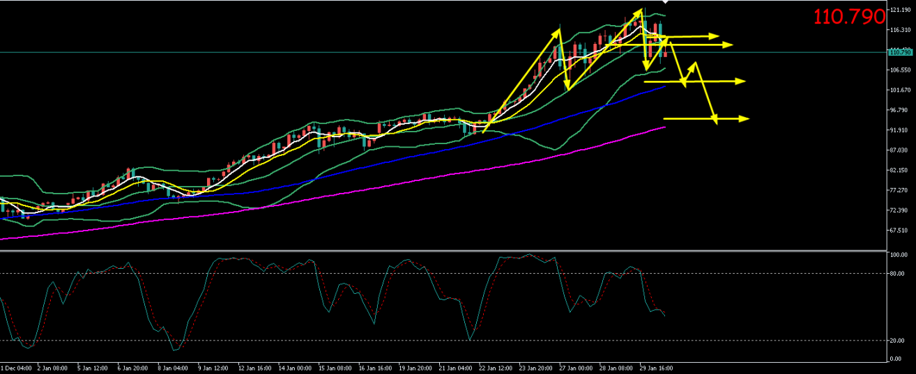 日线图显示,银价在冲击121.58美元的历史天价后,收出经典的“流星线”或“射击之星”形态,这是一个极其强烈的短期见顶反转信号。一日内近9%的震幅和极长的上影线,严重破坏了前期单边上涨的技术结构,确认市场已进入高位调整与震荡阶段。当前,120美元已从突破目标转化为强劲的心理与技术双重阻力。下方,115-117美元区域是隔夜暴跌后反弹的平台,成为首个关键支撑带;若失守,则可能进一步测试112-113美元的更深支撑。