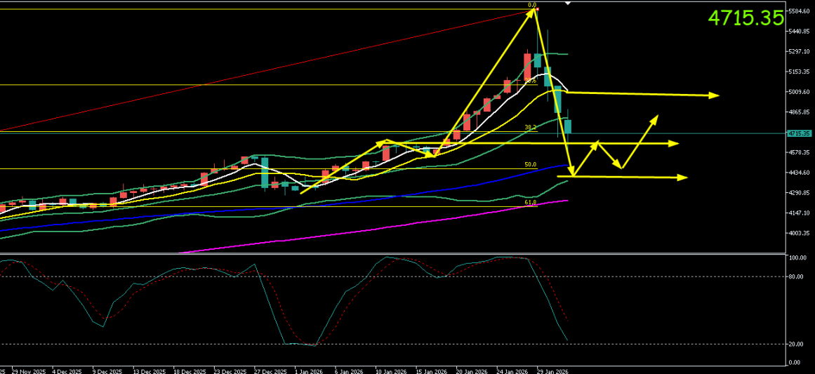 日线图显示,金价在形成“单日反转”顶部后,以连续阴线展开深度调整,已有效跌破4800美元关口及5000美元心理大关,确认中期上涨趋势已被破坏,市场进入明确的调整周期。当前价格正在测试4700美元附近的支撑强度。若失守,下一关键支撑区域看向4550-4600美元(前期重要突破平台及200日移动均线附近)。任何反弹将首先面临4850-4900美元区域的强阻力压制。