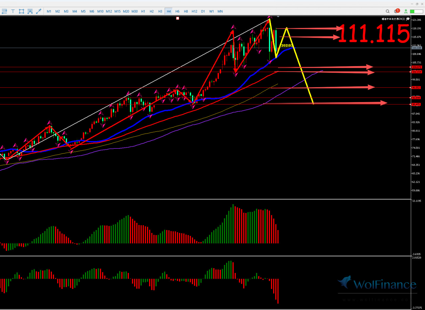 解析:日线AO绿色,AC红色,日线鳄鱼线缠绕;4小时AO绿色,AC绿色,鳄鱼线缠绕向上;银价自48.66涨至83.97后回落,目前最大回落至4小时的60均线后小幅反弹,银价自83.97下跌至4小时的60均线70.00附近判定1小时完成了完整的下跌ABC浪,是故自70.00反弹判定为2小时的反弹B浪或者是3小时的5浪预期,上周五银价自70.00上涨至74.51后下跌回补缺口后再次上涨至82.20附近,此段上涨判定为反弹B浪,之后银价自82.20回落至3小时的89均线附近此段下跌判定为2小时的下跌C浪,当下银价自73.80上涨至现在84.26附近,此段上涨判定为3小时和4小时的上涨5浪预期,70.05到82.20此段上涨判定为4小时的5-1浪,82.20下跌至73.80为下跌5-2浪,银价自73.80上涨判定为开启上涨上方关注107.07-111.92-116.98-121.29-124.76-125.85-134.26目标预期,银价自73.80上涨至95.84判定为5-3浪,之后调整至90.30上涨为5-4浪,银价处于自90.31上涨5-5-3浪中,银价冲击了116.96-121.29目标区间后冲高回落跌至30分钟的120后反弹,银价反弹111.41后回落至30分钟的120均线后再次创新高至121.71后完成1小时的5-5浪后下跌至1小时的120均线附近,当下银价走着1小时的下跌C浪预期理论上看向94.26-88.57-79.36-73.66目标预期,目前银价下跌至73.66即4小时的356及12小时的120均线附近后小幅反弹,日内重点关注73.66-71.65-69.30支撑预期后的反弹预期上方关注90.44-94.50-97.77压力预期。
