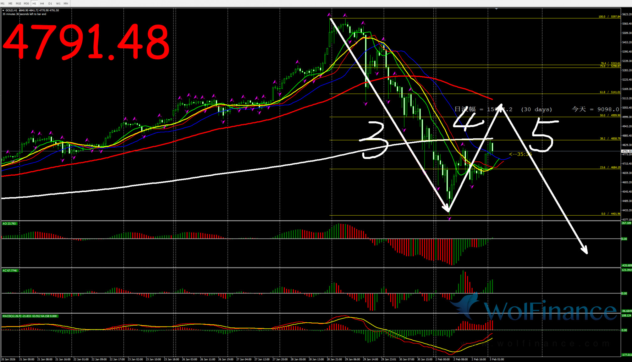 日线级别行情处于3浪行情,关注3浪行情走势,在日线图中关注压力倾向在日线图5600一线附近;支撑倾向在日线图50%(4743);61.8%(4541);四小时行情处于3浪状态,关注3浪的行情走势。支撑倾向在4530附近。1小时图AO零轴下红色,AC零轴下红色,代表在小时图中,行情倾向隔夜小时图处在3浪行情,目前在小时图中关注3浪的行情走势,下方支撑4530附近。在1小时图中,行情上涨压力关注5200附近。