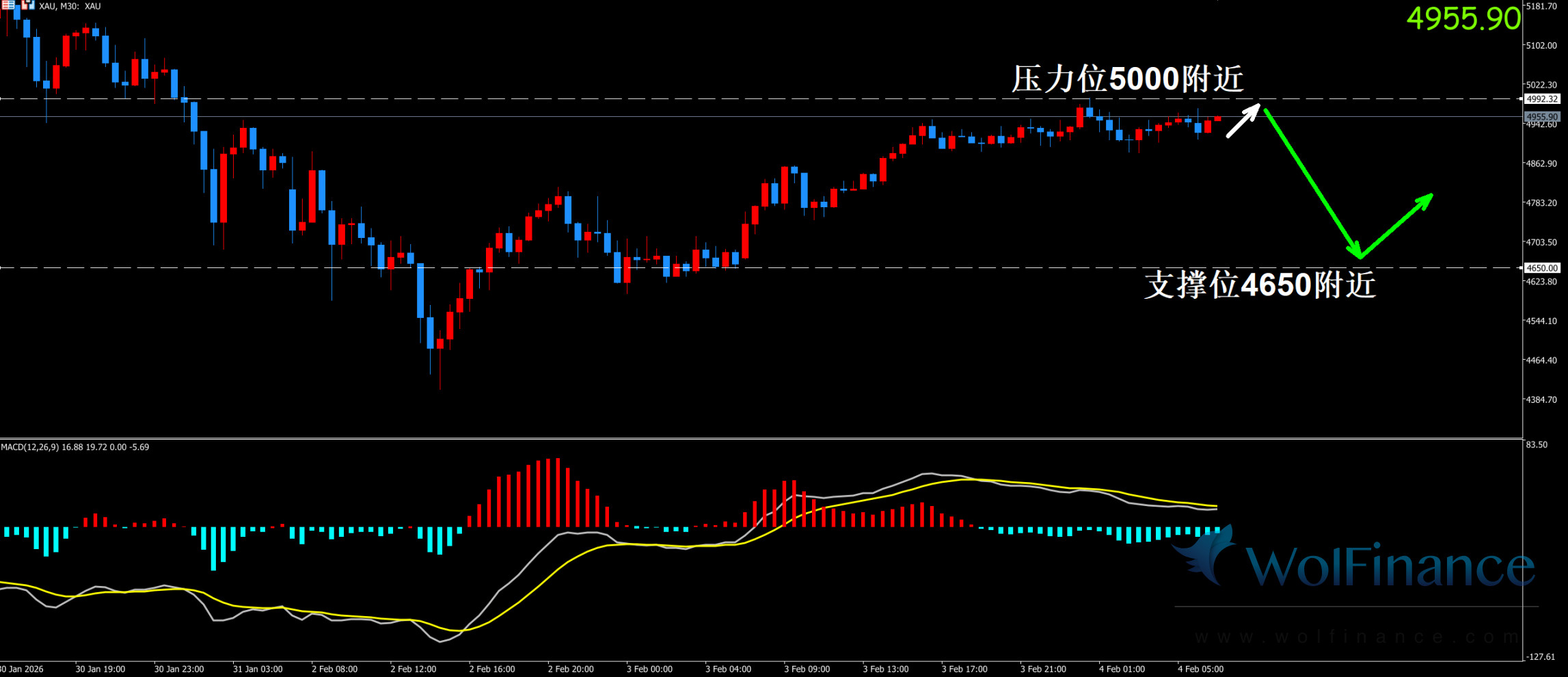 1.布局方案1:金价5000附近空单布局,止损5011, 止盈4900-----4800区间,