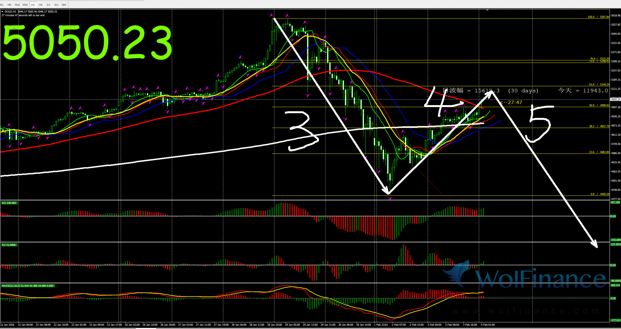 日线级别行情处于3浪行情,关注3浪行情走势,在日线图中关注压力倾向在日线图5600一线附近;支撑倾向在日线图50%(4743);61.8%(4541);四小时行情处于3浪状态,关注3浪的行情走势。支撑倾向在4530附近。1小时图AO零轴上绿色,AC零轴上绿色,代表在小时图中,行情倾向隔夜小时图处在4浪行情,目前在小时图中关注4浪的行情走势,下方支撑4530附近。在1小时图中,行情上涨压力关注5200附近。