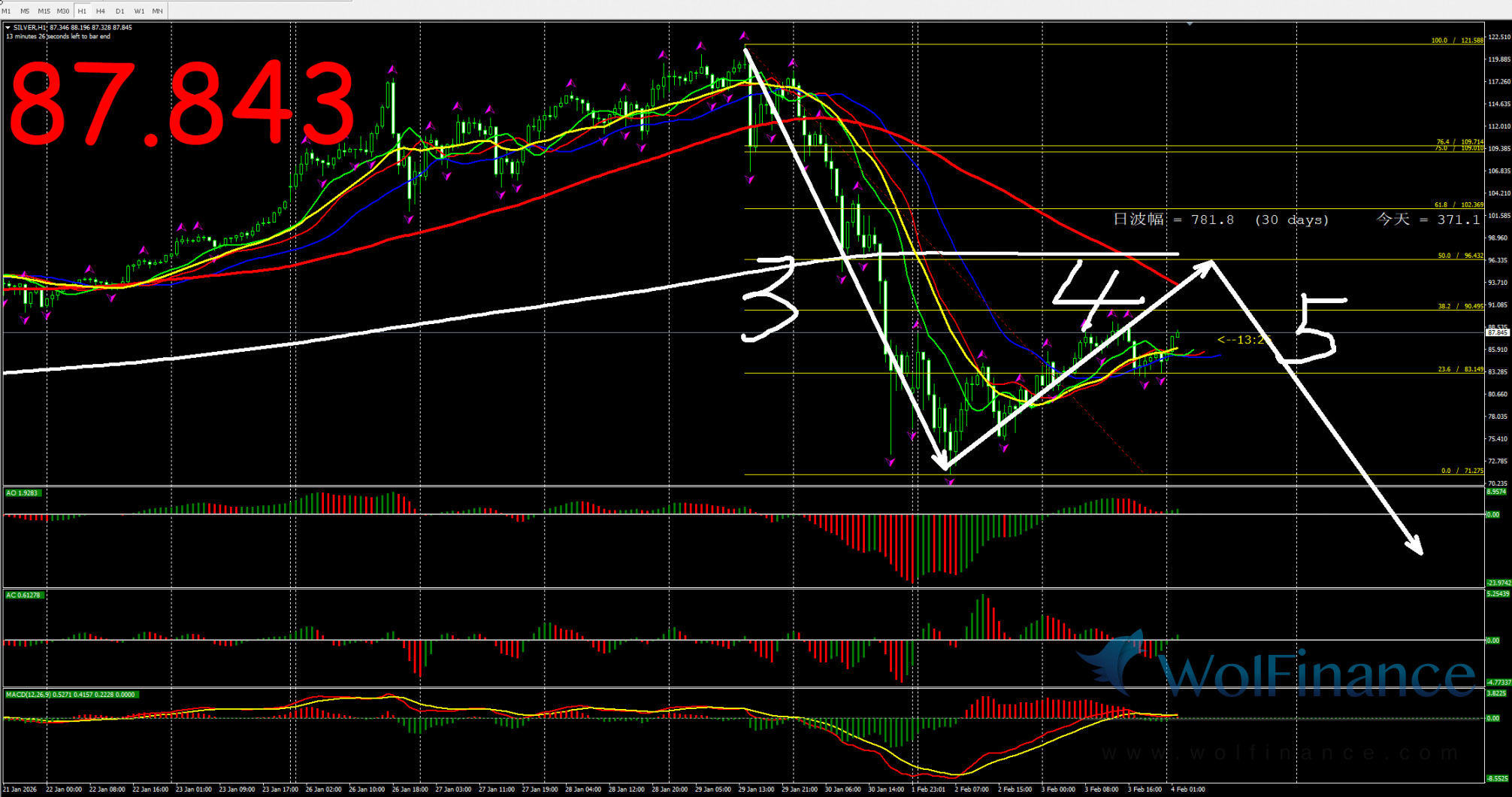 日线图目前处在4浪之中,关注4浪的行情走势。压力倾向在日线图110一线附近;支撑倾向在日线图50%(83.17)和61.8%(74.60)一线附近;四小时行情处在3浪走势;1小时图AO零轴下绿色;AC零轴上红色,行情在小时图356日线之下运行;小时图关注110附近的压力;所以今日关注1小时图震荡行情。