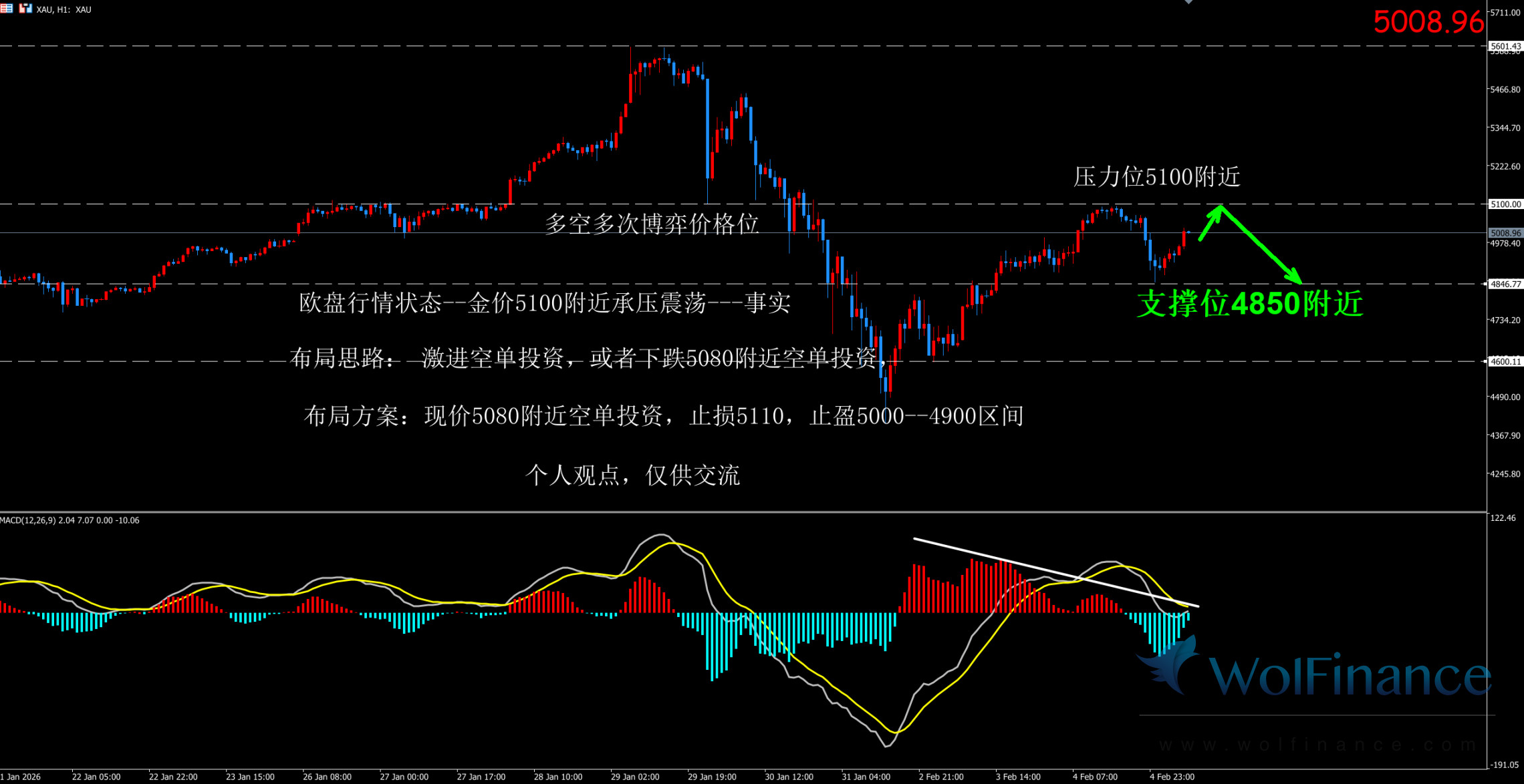 1.布局方案1:5090附近空单布局,止损5105, 止盈4950-----4900区间,