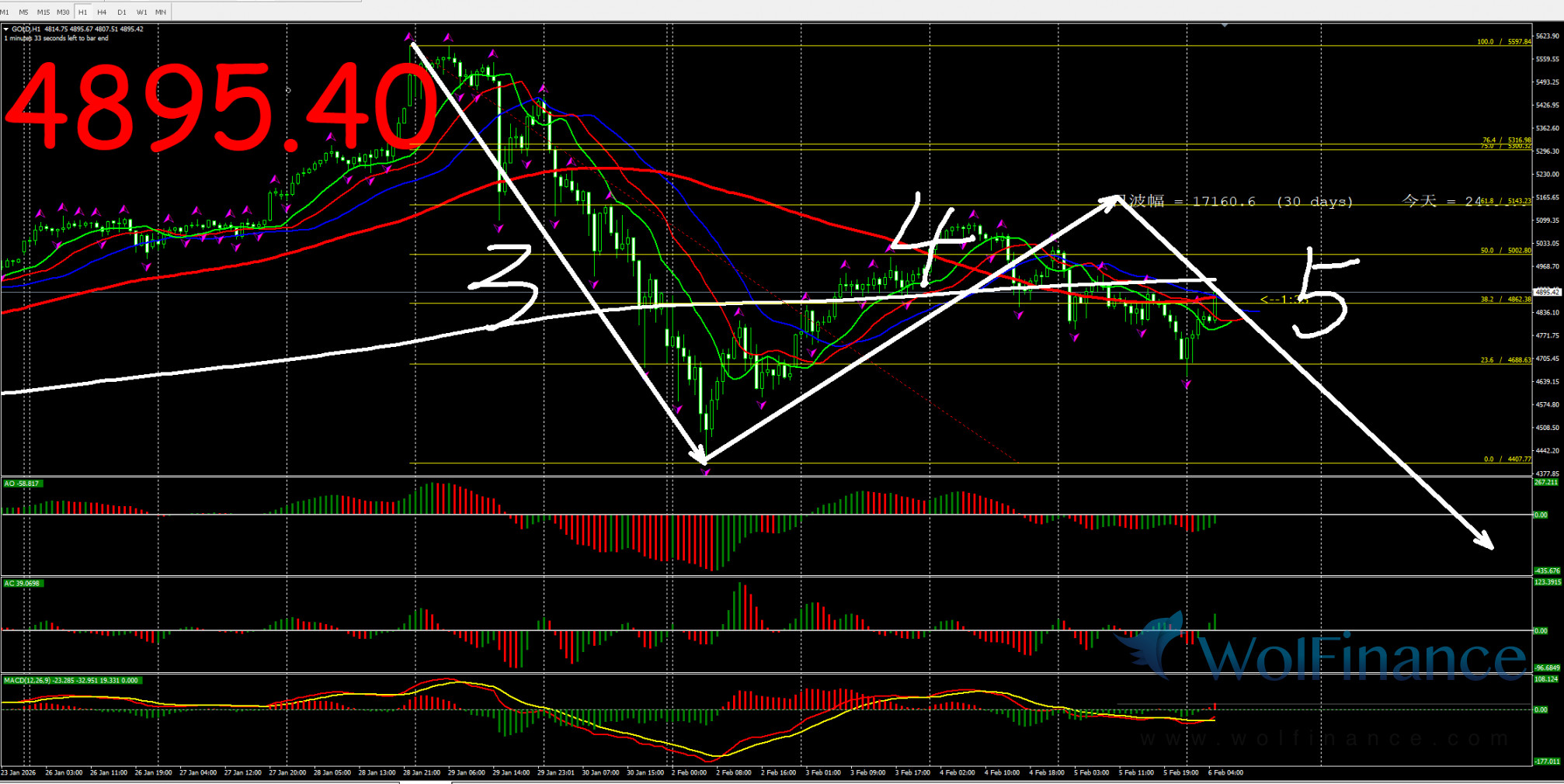 日线级别行情处于3浪行情,关注3浪行情走势,在日线图中关注压力倾向在日线图5600一线附近;支撑倾向在日线图50%(4743);61.8%(4541);四小时行情处于4浪状态,关注4浪的行情走势。支撑倾向在4530附近。1小时图AO零轴下绿色,AC零轴上绿色,代表在小时图中,行情倾向隔夜小时图处在4浪行情,目前在小时图中关注4浪的行情走势,下方支撑4530附近。在1小时图中,行情上涨压力关注5200附近。