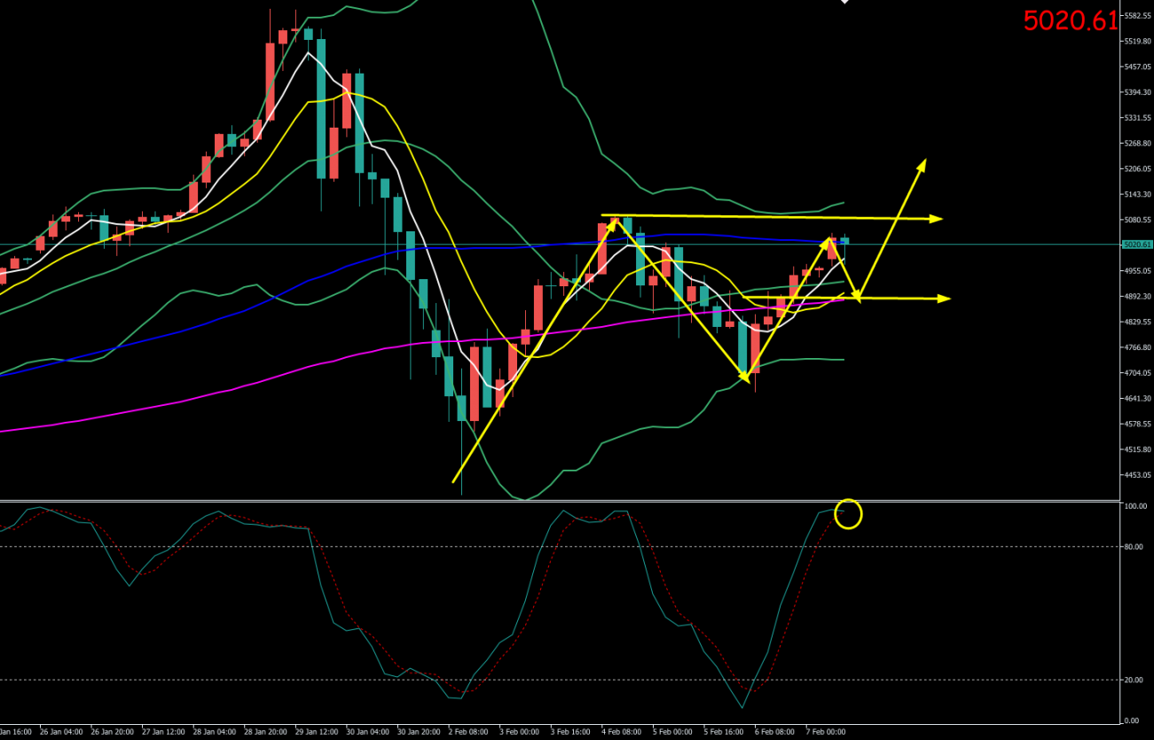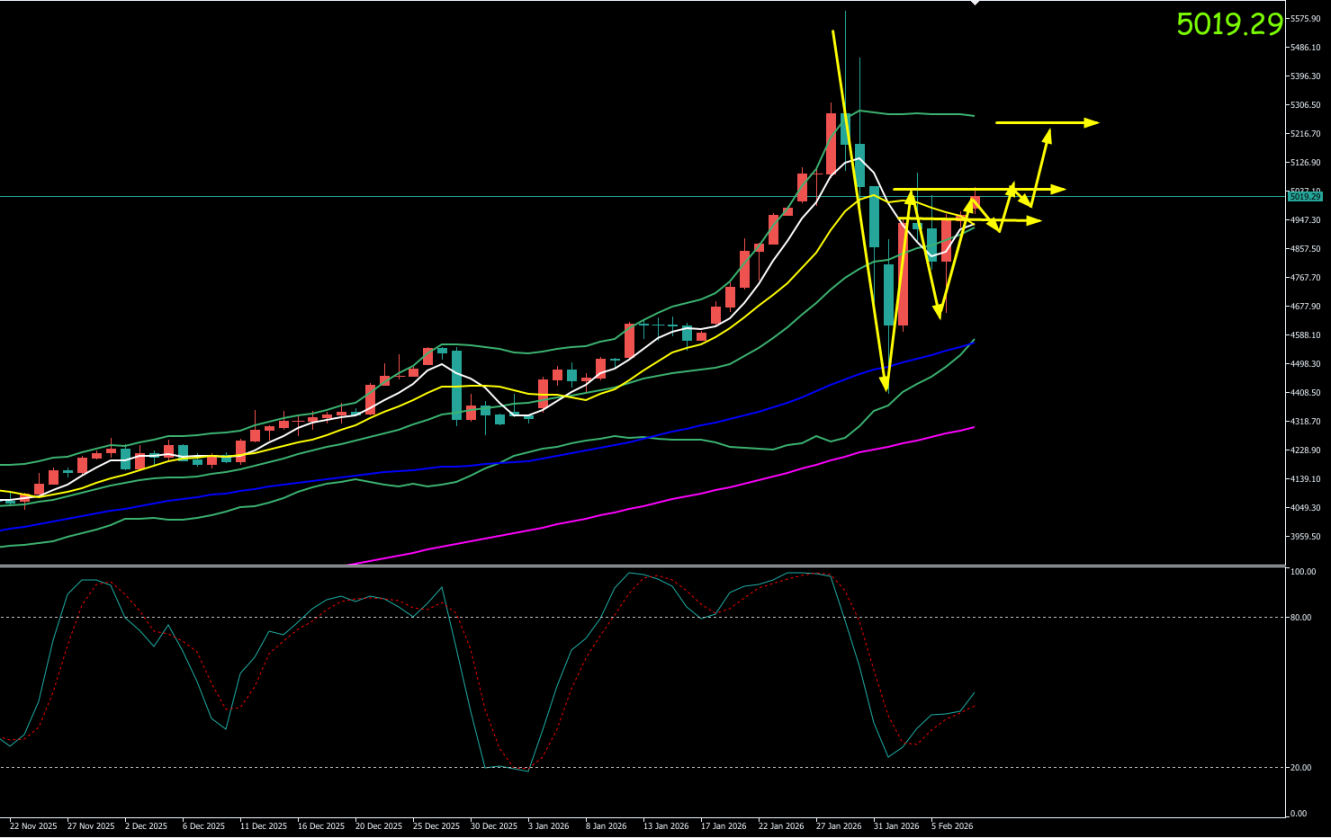 日线图显示,金价在成功守稳4750-4800美元的关键支撑区域后,以连续阳线展开反弹,目前已重返5000美元上方。这表明市场已初步消化了前期暴跌带来的恐慌情绪,进入技术性修复阶段。当前,5050-5100美元区域是反弹面临的首个强阻力带,这里既是前期暴跌的起始平台,也聚集了未出逃的套牢盘。若能有效突破,则有望进一步上探;反之,市场或将在5000美元关口附近展开震荡整理,以积蓄动能。