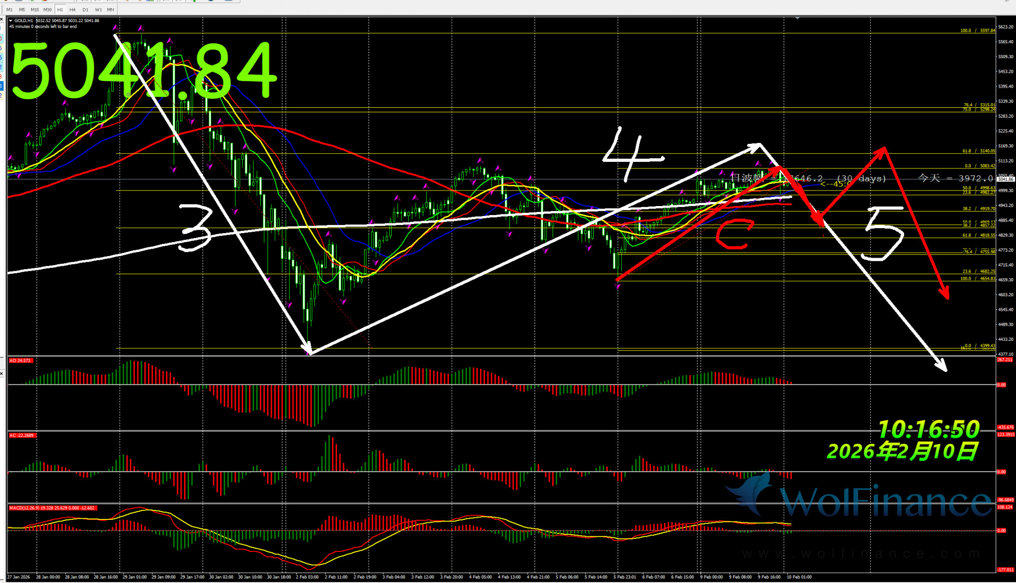 日线级别行情处于3浪行情,关注3浪行情走势,在日线图中关注压力倾向在日线图5600一线附近;支撑倾向在日线图50%(4743);61.8%(4541);四小时行情处于4浪状态,关注4浪的行情走势。支撑倾向在4530附近。1小时图AO零轴上红色,AC零轴下红色,代表在小时图中,行情倾向隔夜小时图处在4浪行情,目前在小时图中关注4浪的行情走势,下方支撑4530附近。在1小时图中,行情上涨压力关注5200附近。