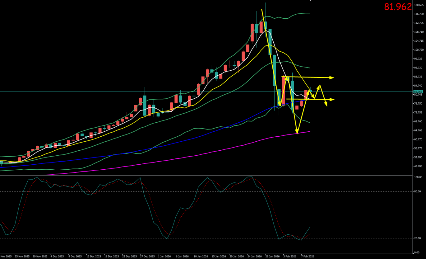日线图显示,银价在历史低点64.10美元形成“单针探底”后,以三连阳强势反弹,昨日最高测试84美元关口。该位置不仅是整数心理关口,也是前期暴跌过程中的一个密集成交区,技术阻力显著。今日的回落可视为对该阻力位的正常测试与消化。若回调能守稳78-80美元的支撑区域(前突破位及5日均线附近),则反弹结构有望保持完好;若失守,则可能再度进入75-84美元的宽幅震荡区间。