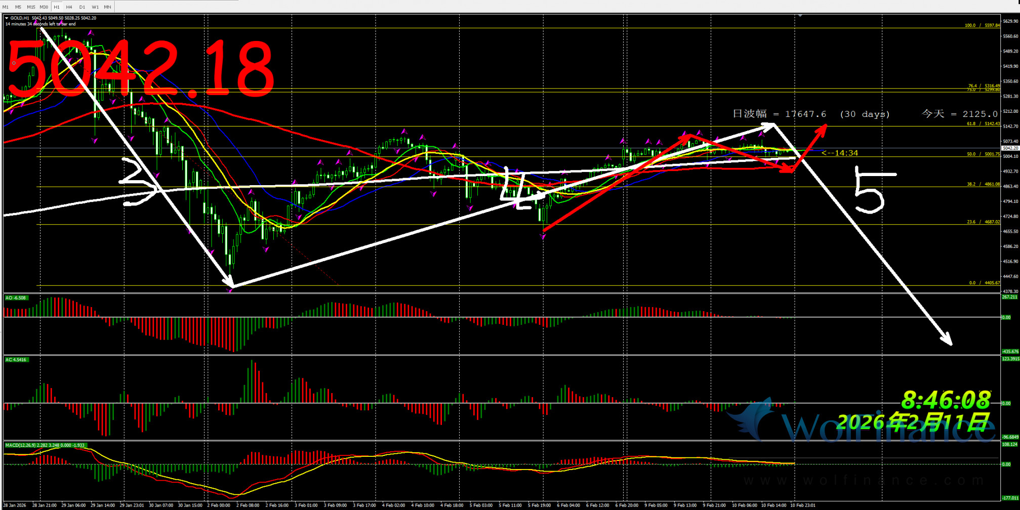 日线级别行情处于3浪行情,关注3浪行情走势,在日线图中关注压力倾向在日线图5600一线附近;支撑倾向在日线图50%(4743);61.8%(4541);四小时行情处于4浪状态,关注4浪的行情走势。支撑倾向在4530附近。1小时图AO零轴下绿色,AC零轴上绿色,代表在小时图中,行情倾向隔夜小时图处在4浪行情,目前在小时图中关注4浪的行情走势,下方支撑4530附近。在1小时图中,行情上涨压力关注5200附近。