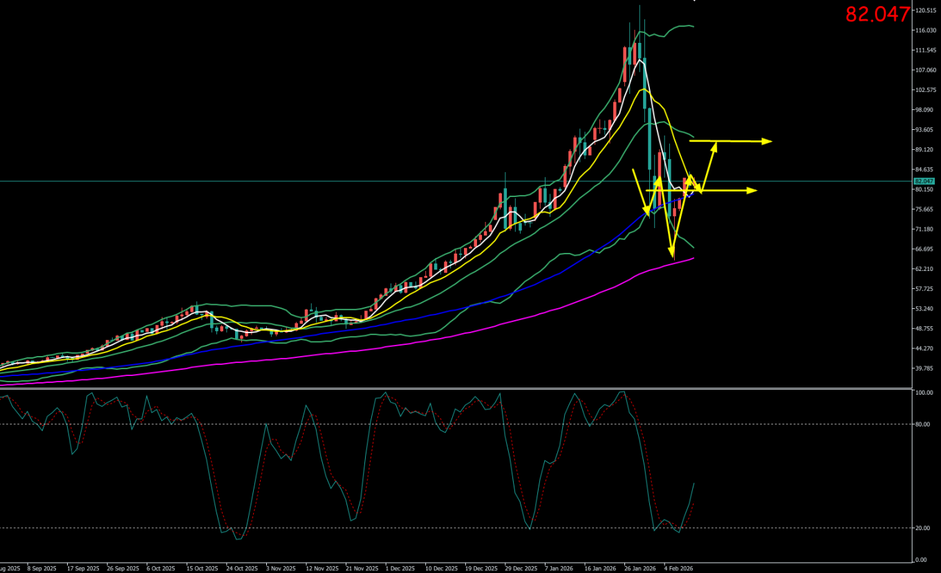 日线图显示,银价在历史低点64.10美元形成“单针探底”后,反弹于84美元关口遭遇明显阻力。随后的回落构成了一个高位整理平台,价格在78-84美元的大区间内震荡。当前,82美元成为亚市反弹的初步阻力,若能有效突破并站稳,则有望再次上攻84-85美元的核心阻力带。下方,80美元整数关口及78.50美元(接近10日均线)构成了短期的重要支撑区间。市场正处于选择方向的临界点。