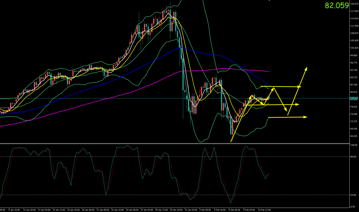 4小时图呈现触底反弹后的震荡上行通道。价格在80美元附近获得支撑后,短期均线系统有再度拐头向上的迹象。MACD指标在零轴附近有形成金叉的趋势,绿色动能柱持续收缩,显示短线空头动能衰竭,多头正在蓄力。亚盘的稳步上涨为欧盘测试更高阻力奠定了基础,需关注价格能否在欧盘时段守住82美元上方。