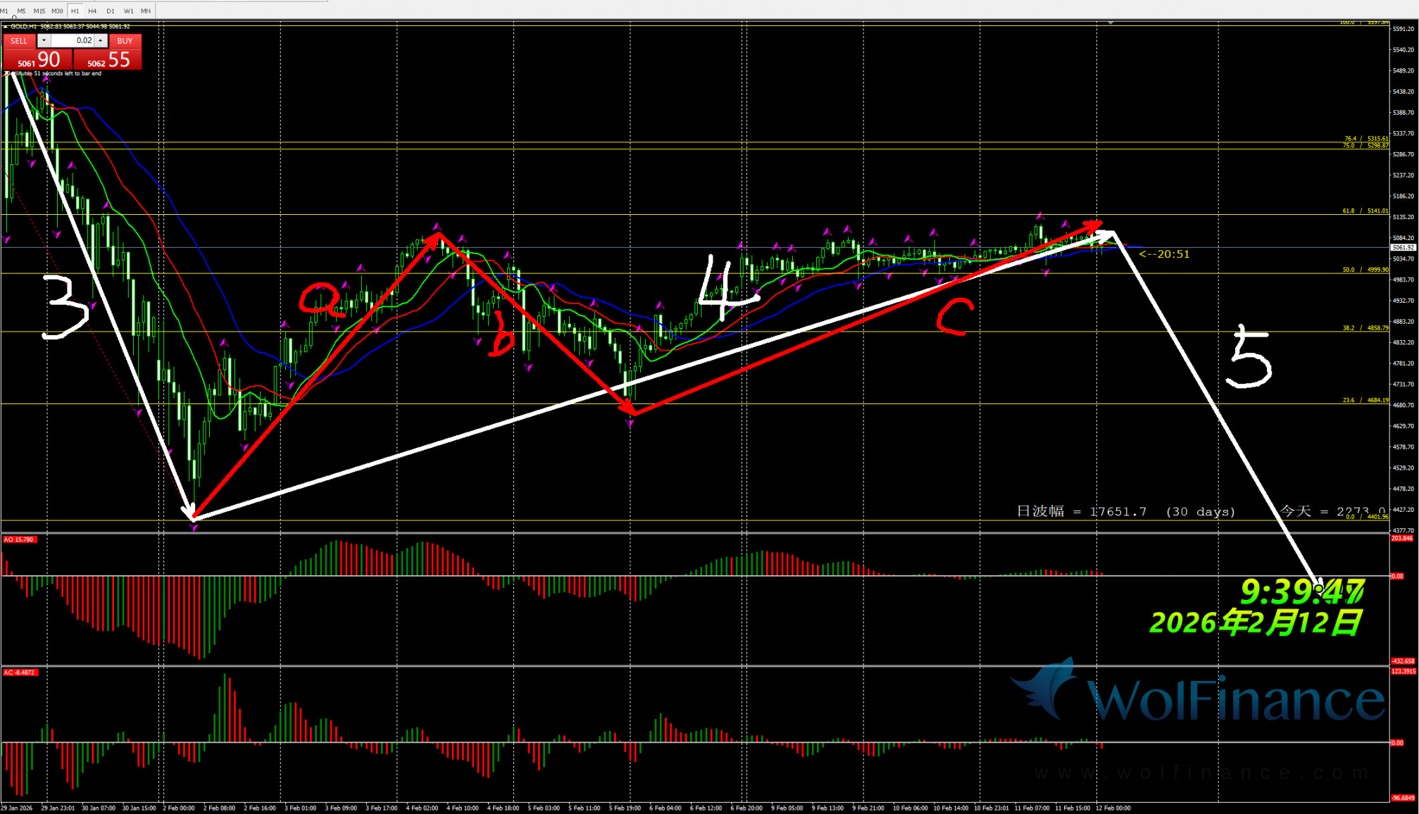 日线级别行情处于3浪行情,关注3浪行情走势,在日线图中关注压力倾向在日线图5300一线附近;支撑倾向在日线图50%(4743);61.8%(4541);四小时行情处于4浪状态,关注4浪的行情走势。支撑倾向在4530附近。1小时图AO零轴上红色,AC零轴下红色,代表在小时图中,行情倾向隔夜小时图处在4浪行情,目前在小时图中关注4浪的行情走势,下方支撑4530附近。在1小时图中,行情上涨压力关注5300附近。