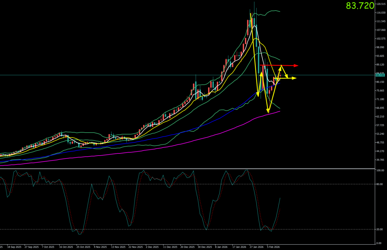 4小时图呈现典型的“利好出尽”式冲高回落形态。价格在触及85.57美元后连续收出阴线,MACD指标在高位形成死叉,红色动能柱快速转化为绿色柱放量,显示短线空头动能正在释放。亚盘时段的探底回升初步验证了81.70美元附近的短期买盘支撑,但反弹量能相对温和。日内需重点关注银价能否重新收复84美元关口,若能站稳,则有望进入82-85美元的新震荡区间;若持续承压于83.50美元下方,则弱势整理格局将延续。