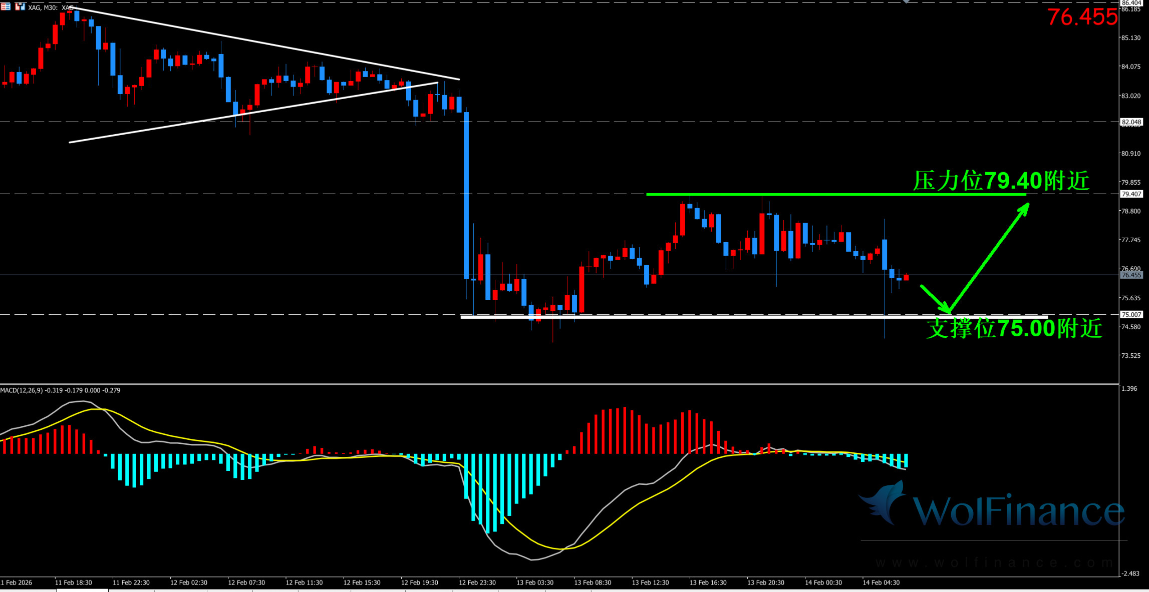 1. 白银技术图表显示目前K线支撑位75.00附近