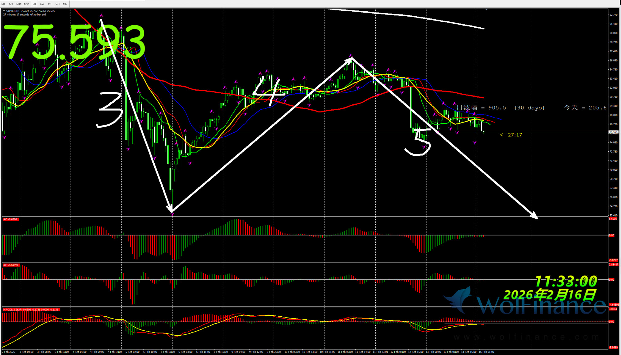 1、白银关注76.70附近做空,止损:77.70;目标:75.30;74.30;73.10;
