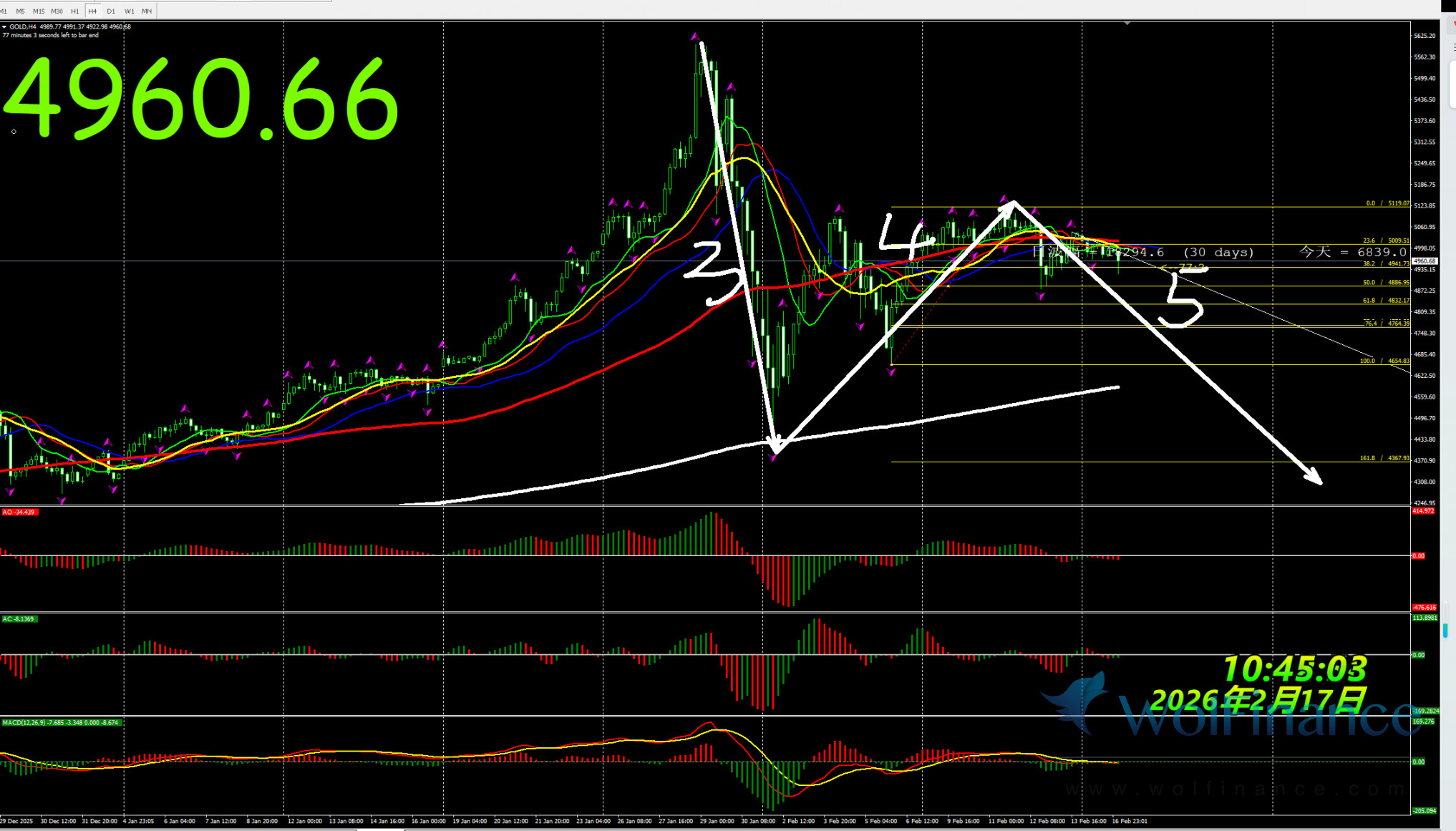 日线级别行情处于3浪行情,关注3浪行情走势,在日线图中关注压力倾向在日线图5300一线附近;支撑倾向在日线图50%(4743);61.8%(4541);四小时行情处于4浪状态,关注4浪的行情走势。支撑倾向在4530附近。1小时图AO零轴上红色,AC零轴下红色,代表在小时图中,行情倾向隔夜小时图处在5浪行情,目前在小时图中关注5浪的行情走势,下方支撑4530附近。在1小时图中,行情上涨压力关注5300附近。