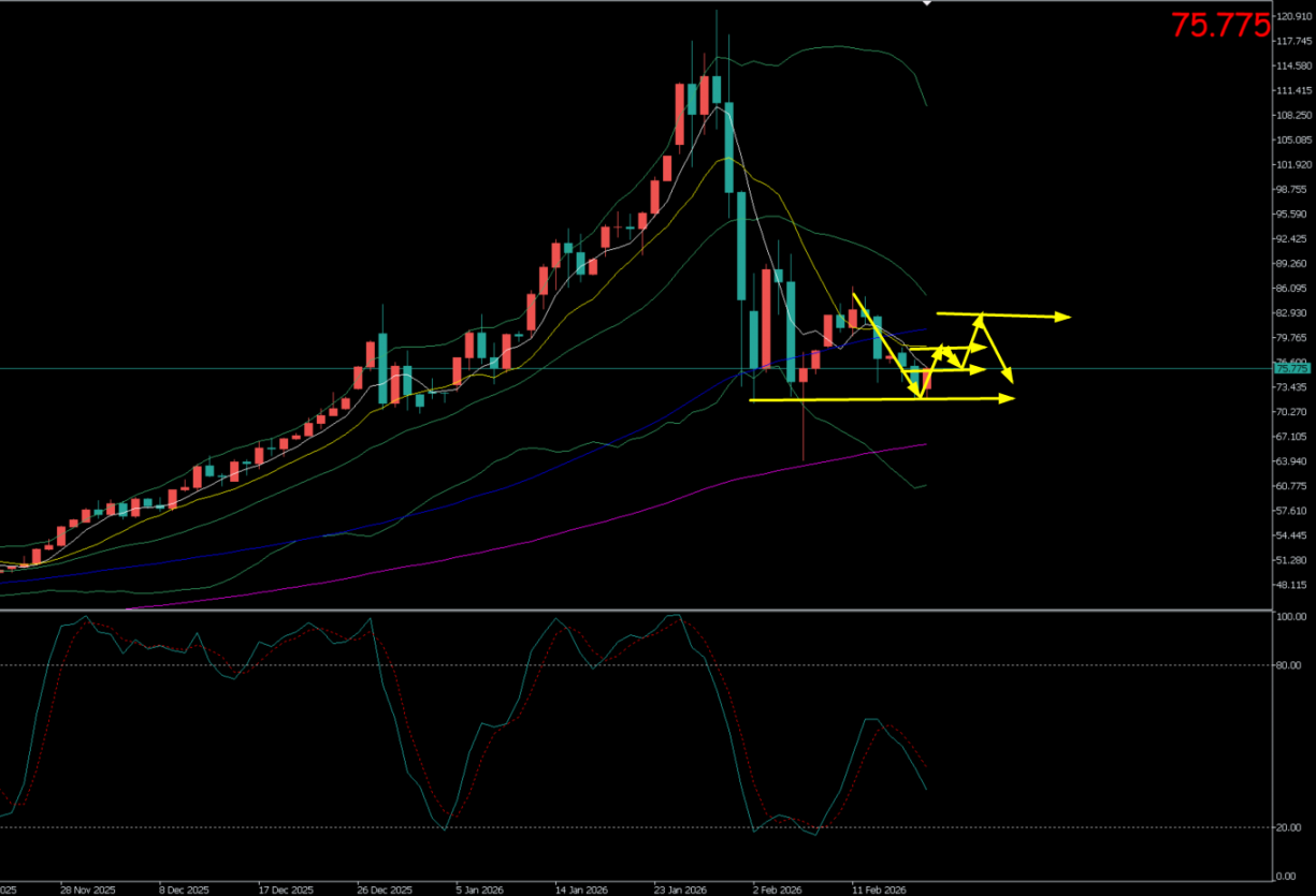 周三(2月18日)亚市早盘,银价在隔夜暴跌后于低位弱势盘整,市场情绪极度谨慎。价格开盘于73.44美元/盎司附近,开盘后多空短暂拉锯,盘中最高反弹至73.74美元/盎司,最低回踩至72.24美元/盎司。现货白银交投于75.65美元/盎司附近。注意日内反弹力度,以及75.8一线关键压力得失