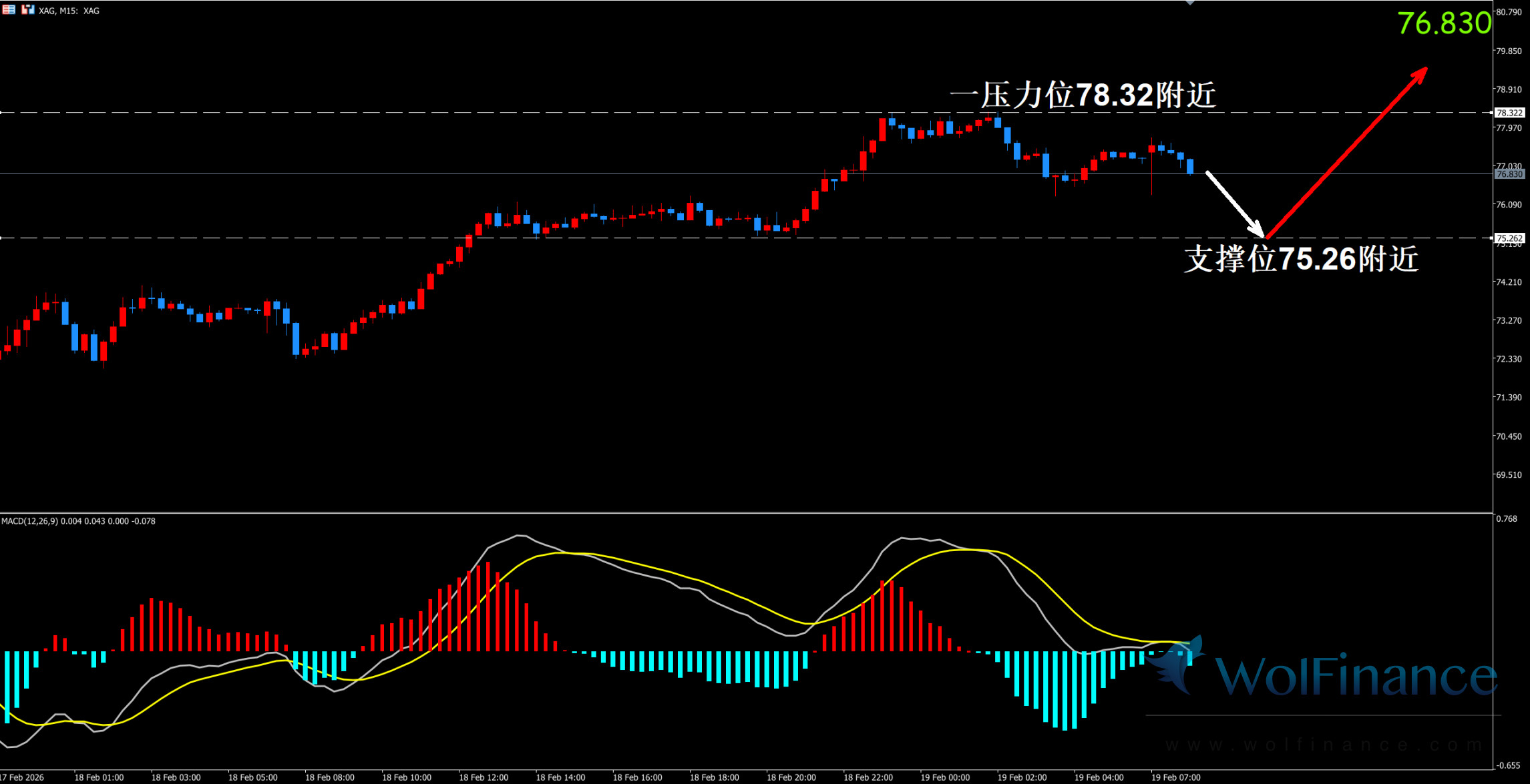1. 白银技术图表显示目前K线支撑位75.26附近