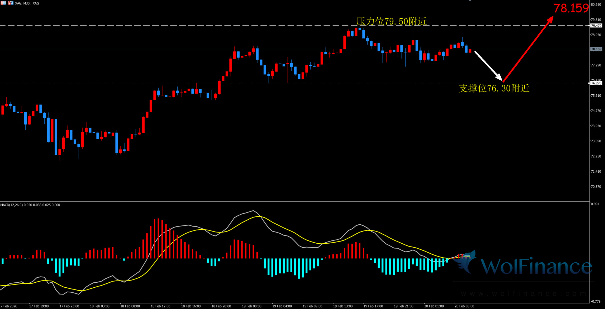 1. 白银技术图表显示目前K线支撑位76.30附近