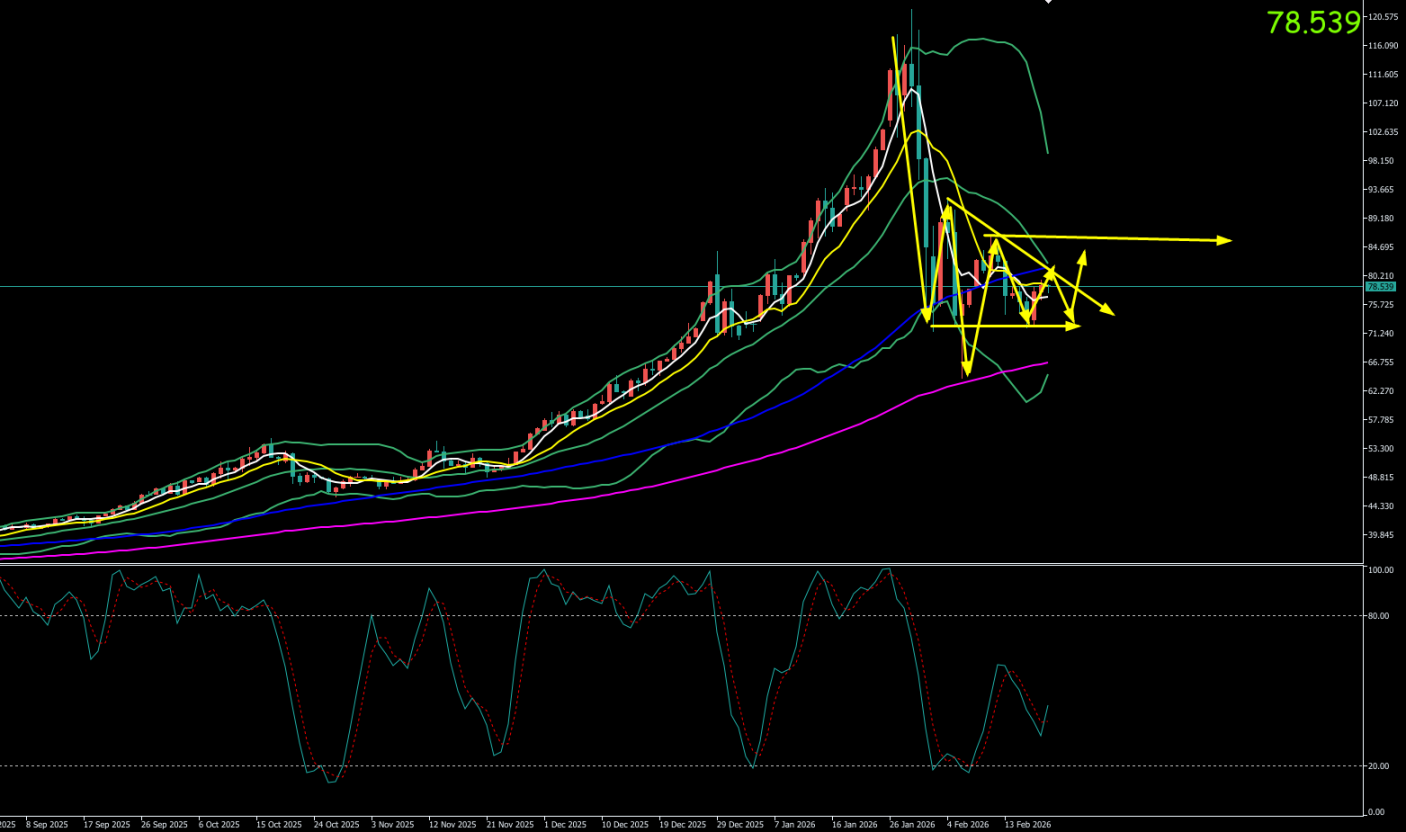 周四(2月19日),现货白银在连续两日强劲反弹后进入高位整理,多空双方围绕78美元关口展开温和博弈。价格开盘于77.30美元/盎司,亚欧盘时段延续反弹惯性,最高触及79.18美元/盎司的一周新高。纽约时段,受部分获利盘了结影响,银价小幅回落,最低下探至76.39美元/盎司,最终收盘于77.18美元/盎司附近。日线收出一根十字星阴线,单日微跌0.35%,显示在快速反弹后,市场需要时间消化涨幅并等待新的催化剂。