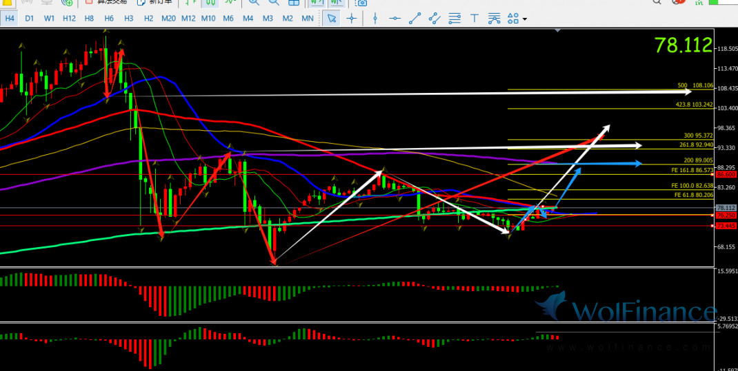 解析:日线AO绿色,AC绿色,日线鳄鱼线缠绕;4小时AO红色,AC红色,鳄鱼线缠绕向上;银价自48.66涨至83.97后回落,目前最大回落至4小时的60均线后小幅反弹,银价自83.97下跌至4小时的60均线70.00附近判定1小时完成了完整的下跌ABC浪,是故自70.00反弹判定为2小时的反弹B浪或者是3小时的5浪预期,上周五银价自70.00上涨至74.51后下跌回补缺口后再次上涨至82.20附近,此段上涨判定为反弹B浪,之后银价自82.20回落至3小时的89均线附近此段下跌判定为2小时的下跌C浪,当下银价自73.80上涨至现在84.26附近,此段上涨判定为3小时和4小时的上涨5浪预期,70.05到82.20此段上涨判定为4小时的5-1浪,82.20下跌至73.80为下跌5-2浪,银价自73.80上涨判定为开启上涨上方关注107.07-111.92-116.98-121.29-124.76-125.85-134.26目标预期,银价自73.80上涨至95.84判定为5-3浪,之后调整至90.30上涨为5-4浪,银价处于自90.31上涨5-5-3浪中,银价冲击了116.96-121.29目标区间后冲高回落跌至30分钟的120后反弹,银价反弹111.41后回落至30分钟的120均线后再次创新高至121.71后完成1小时的5-5浪后下跌至1小时的120均线附近,银价走着1小时的下跌C浪预期理论上看向94.26-88.57-79.36-73.66目标预期,银价下跌至73.66即4小时的356及12小时的120均线附近后反弹至1小时的89均线和4小时的蓝色线后再次下跌至日线的120均线63.80后反弹,银价2小时上从浪形上看金价走着下跌5-3浪之后的5-4或者反转A浪中,银价反弹站上了2小时的60和89均线84.96附近,当下判定反弹A浪成立且仍处于A浪中是故看向上方关注92.12-94.10-99.49-100.97-107.12目标预期,银价反弹至86.23后回落目前银价跌至71.69附近后反弹站上1小时的蓝色线打坏了下跌结构且验证了
