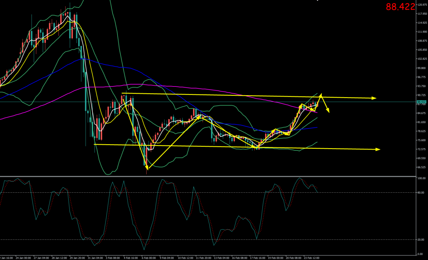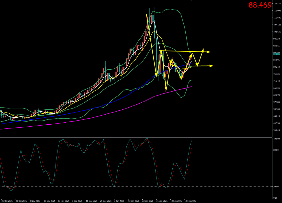 周一(2月23日),现货白银在地缘紧张局势与供需缺口的双重驱动下延续强势,多头氛围浓厚。价格开盘于86.95美元/盎司,亚欧盘时段高位整固后,纽约时段买盘再度发力,最高触及89.05美元/盎司,逼近89美元整数关口,最终收盘于88.32美元/盎司附近。日线收出一根实体阳线,单日涨幅2.58%,连续第三个交易日收阳。