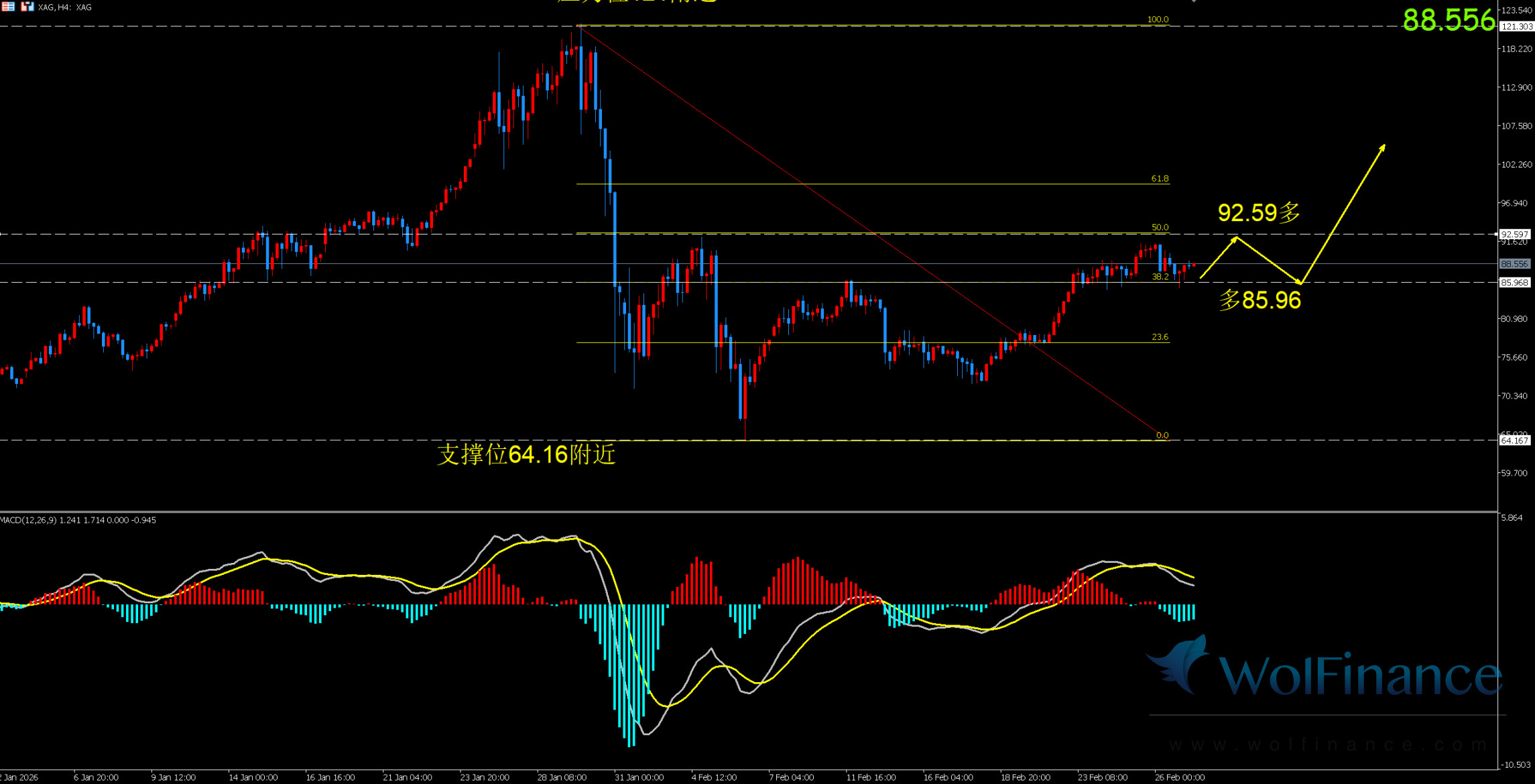 1. 白银技术图表显示目前K线支撑位85.96附近