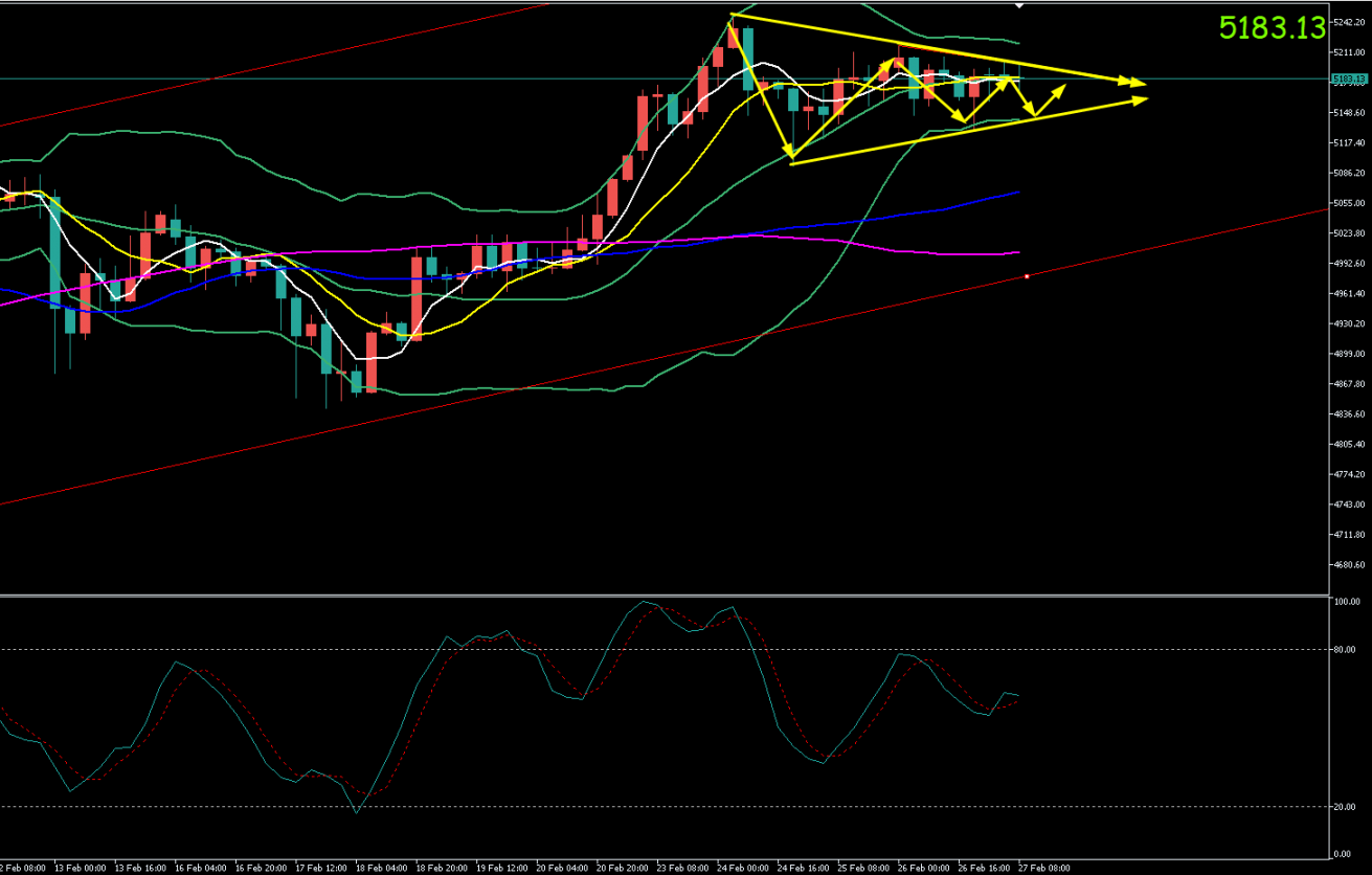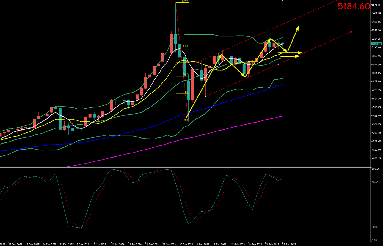 周五(2月27日)亚市早盘至午盘,金价延续窄幅整理格局,多空双方围绕5180美元关口温和博弈。截至北京时间11:19,现货黄金交投于5182美元/盎司附近。日内最高触及5190美元/盎司上方,最低回踩至5170美元/盎司一线。盘面呈现典型的“突破前蓄势”特征,市场在等待新的催化剂。