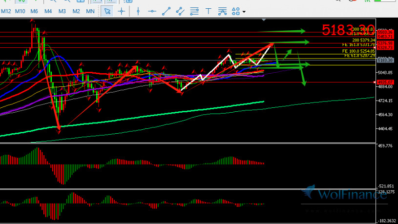解析:日线AO绿色 和AC绿色,4小时AO红色和AC红色,金价从12小时周期上看金价自4274涨至5596后回落至5445后反弹至5595后共振下跌至日线的60均线和4小时的356均线后反弹至5092后回落至4566后再次反弹至5116,金价处于自4274上涨段的调整浪中;从目前走势看金价反弹至5116超过前反弹点5092后回落,金价承压于5116-5030一带震荡下跌,最终在5018-4969之间震荡形成2小时的混沌点,金价下破了4969下分型下破跌至2小时的356均线4850附近后反弹,目前金价反弹至4小时的120均线5022后在5022-4963之间走收敛性震荡,且1小时上目前形成5014-4981之间形成小时的混沌点后金价上破混沌点走出都投趋势且接近了第一目标区5254-5323后回落,昨日金价涨至5251完成了15分钟的上涨5浪结构后下跌对4966-5251上涨段进行修正ABC调整最终跌至30分钟的144均线及4小时的齿线后反弹最高至5210附近,下跌段开启了30分钟和1小时的4-a浪预期金价自5093反弹至5217判定为可以是4-b或者是1小时的5浪预期,当下金价在5151-5217之间震荡,昨日金价跌至1小时的120均线后再次起涨,目前1小时又完成调整4浪预期金价有走5浪破5249前高预期,当下15分钟形成5190-5180的混沌点且上破了,日内上方先看5281-5323-5378-5456目标预期后看1小时完成5浪后的调整预期下方关注5130-5093-5042-4995一带支撑预期。