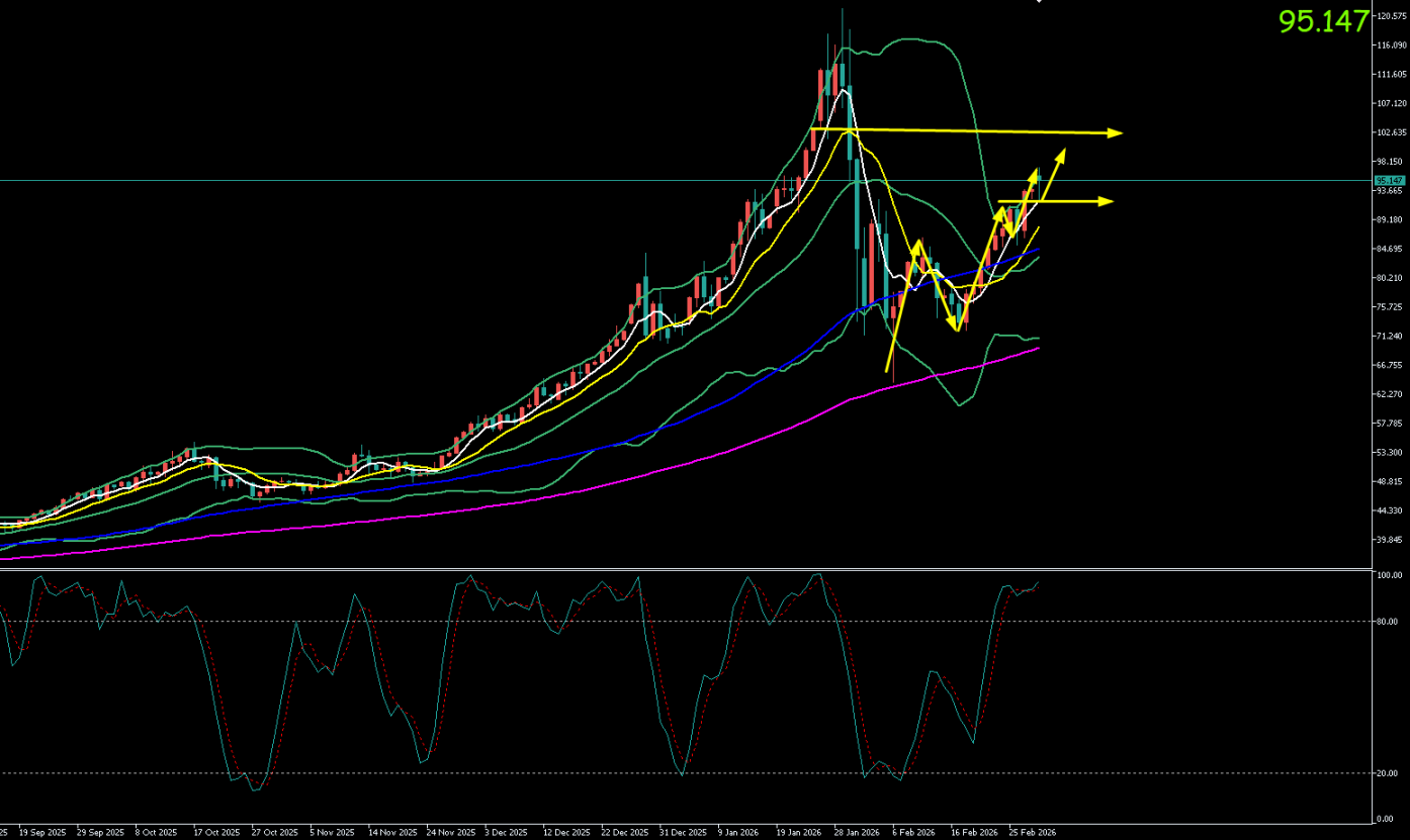 本周一(3月2日)亚市早盘至午盘,受周末中东局势骤然升级影响,白银价格跳空高开逾5美元,一度逼近95美元整数关口。现货白银交投于95.07美元/盎司附近。日内最高触及95.50美元/盎司,最低回踩至92.85美元/盎司一线。盘面呈现典型的“事件驱动型”突破行情,多头动能充沛。