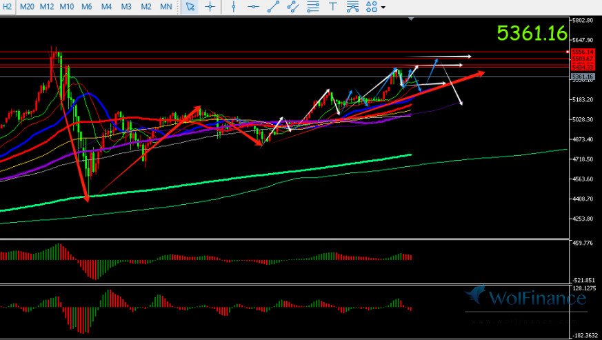 1. 激进者在5376-5400试空,稳健者5453-5503空,止损18-25美金,若走出25美金以上利润后下移保本损后看40-60美金平仓。
