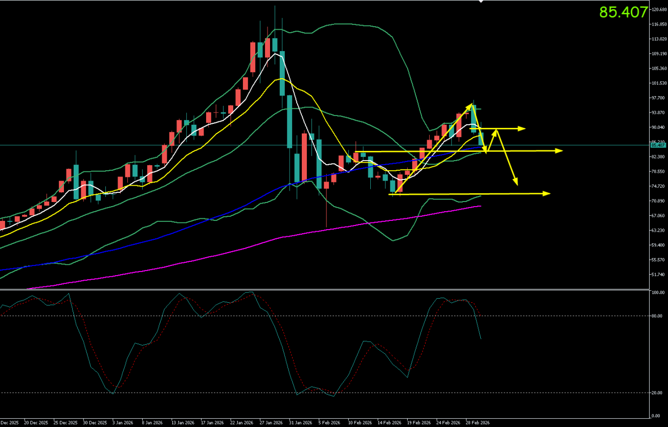 周二(3月2日),现货白银在多地缘紧张影响下冲高回落。价格开盘于95.69美元/盎司,亚欧盘时段弱势震荡,纽约时段抛压加剧,最低下探至86.35美元/盎司,创3月1日以来新低,最终收盘于89.26美元/盎司附近。日线收出一根实体阴线,单日跌幅1.79%,连续第二个交易日收阴,短期顶部形态进一步确认。