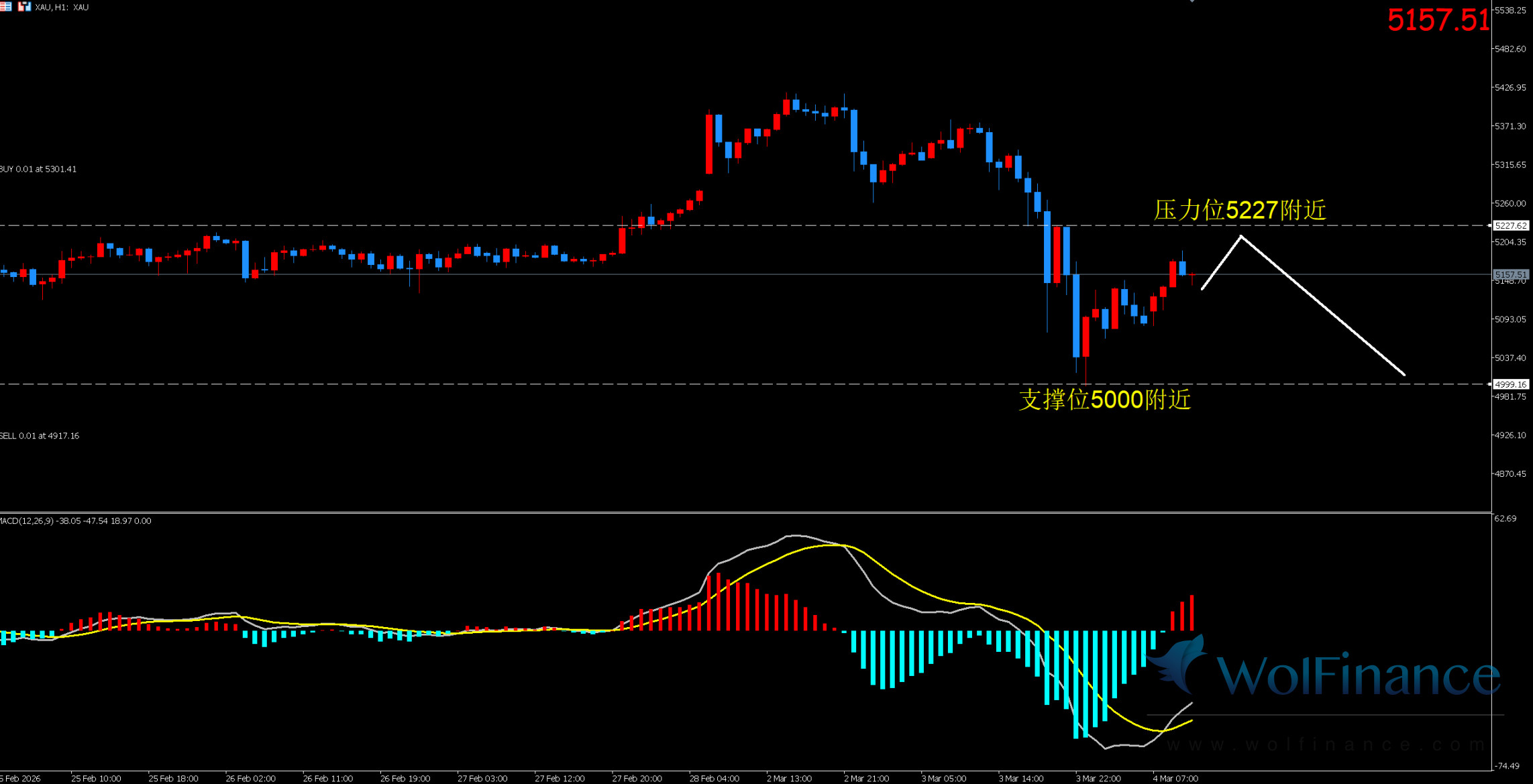 1. 黄金技术图表显示目前K线支撑位5000附近