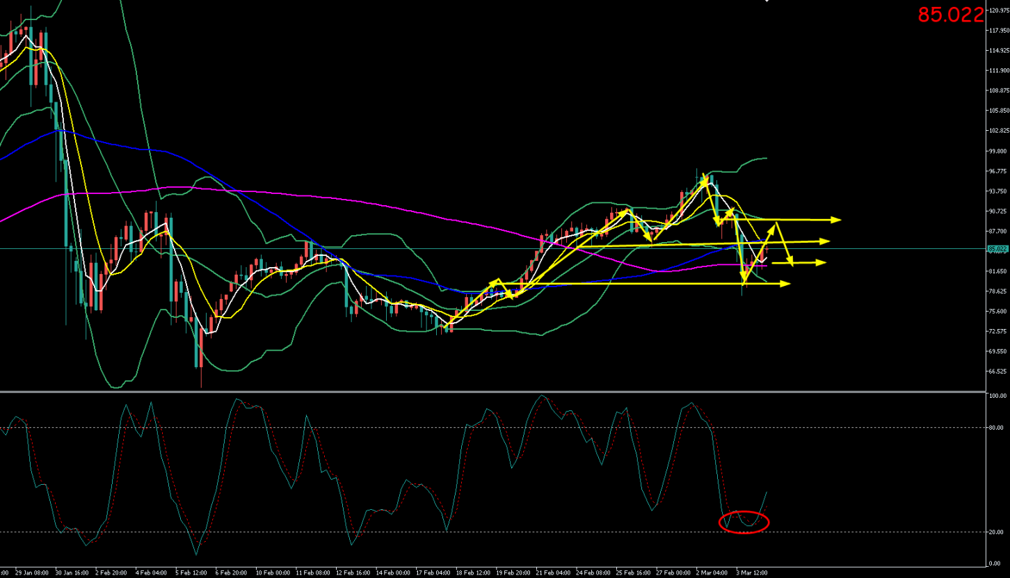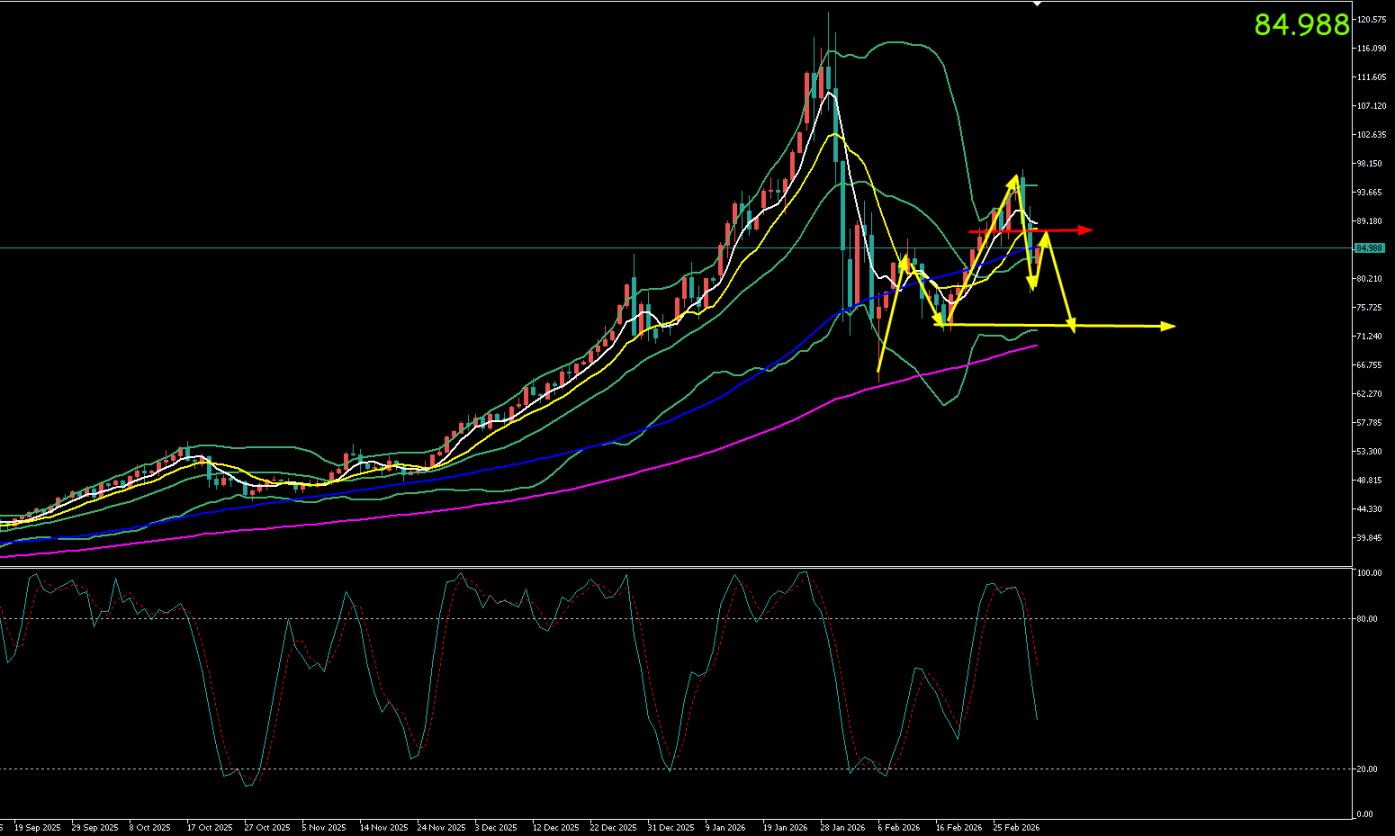 日线图显示,银价在95.50美元形成阶段性顶部后,昨日收出实体巨阴线,形成高位“看跌吞没”形态,这是短期多头动能衰减的重要信号。当前,85美元已从支撑转化为强阻力,下方下一目标指向80.00-82.00美元区域(2月中旬整理平台)。MACD指标红色动能柱已转为绿色,快慢线在高位形成死叉,显示日线级别调整压力正在释放。均线系统方面,5日均线已拐头向下,与10日均线形成死叉,空头排列初现。