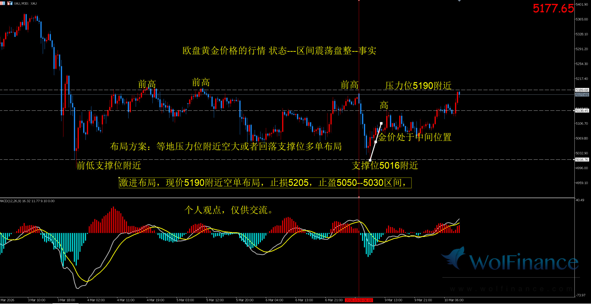 周二(3月10日)亚市早盘,现货黄金连续上涨,金价触及前高压力位附近。市场关注压力位能否突破,如果突破继续追涨看多,承压则进行空单布局方案,市场投资止损较小,合适亚盘短空承压布局,同时地缘冲突升级:避险需求与通胀双刃剑并存中东局势急剧恶化成为本轮金价波动的核心导火索。以色列军方对伊朗中部及黎巴嫩贝鲁特发动新一轮袭击,伊朗方面则任命莫杰塔巴·哈梅内伊接替其父担任最高领袖,强硬派势力牢牢掌控大局,公开宣誓“效忠至最后一滴血”。霍尔木兹海峡实质性封锁,全球五分之一的石油和液化天然气运输命脉被掐断,导致布伦特原油期货一度暴涨29%,触及每桶近120美元高位,最终收涨约7%至98.96美元附近。这种能源供应中断直接点燃全球通胀恐慌。油价飙升传导至更广泛的商品价格,农产品、铝等大宗商品纷纷创出数月或数年新高。黄金本应作为经典通胀对冲工具大放异彩,但现实却相反:高通胀叠加美联储降息预期大幅后移,反而强化了美元的强势地位。美元指数一度触及三个月高点,以美元计价的黄金对非美货币持有者变得更加昂贵,引发抛售压力。