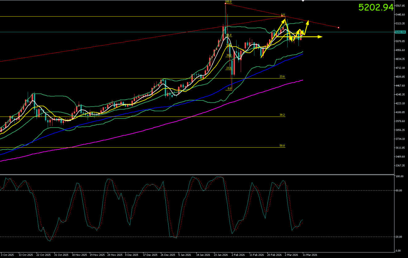 周三(3月11日)亚市早盘至午盘,金价在隔夜高位附近呈现高位整固格局,多头攻势暂缓。现货黄金交投于5204.9美元/盎司附近。日内最高触及5223.7美元/盎司上方,最低回踩至5183.72美元/盎司一线。盘面呈现典型的“突破后蓄势”特征,市场正静待晚间美国CPI通胀数据提供进一步方向指引。
