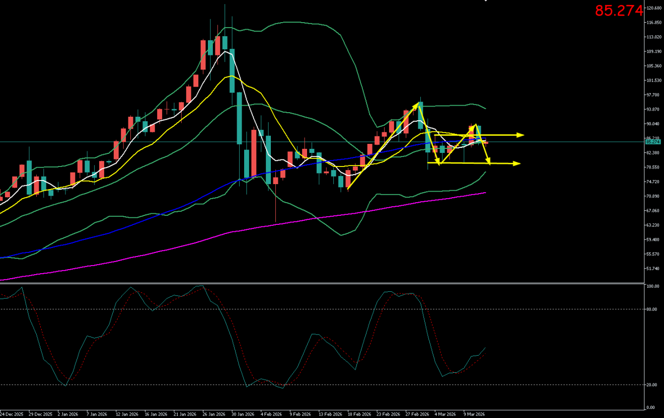 4小时图呈现清晰的“破位下行”形态。价格在跌破87美元后加速下行,均线系统开始拐头向下,MACD指标在零轴下方形成死叉,绿色动能柱持续放量,显示短线空头动能正逐步积聚。亚盘时段的弱势反弹受制于85.60美元一线,量能配合不足,属典型的技术性反抽。布林带开口有收窄迹象,显示市场多空双方力量相对均衡,短期可能继续维持震荡走势。日内需重点关注银价能否守住84.00美元短期支撑,若失守,则可能进一步向82.50-83.00美元寻求支撑。