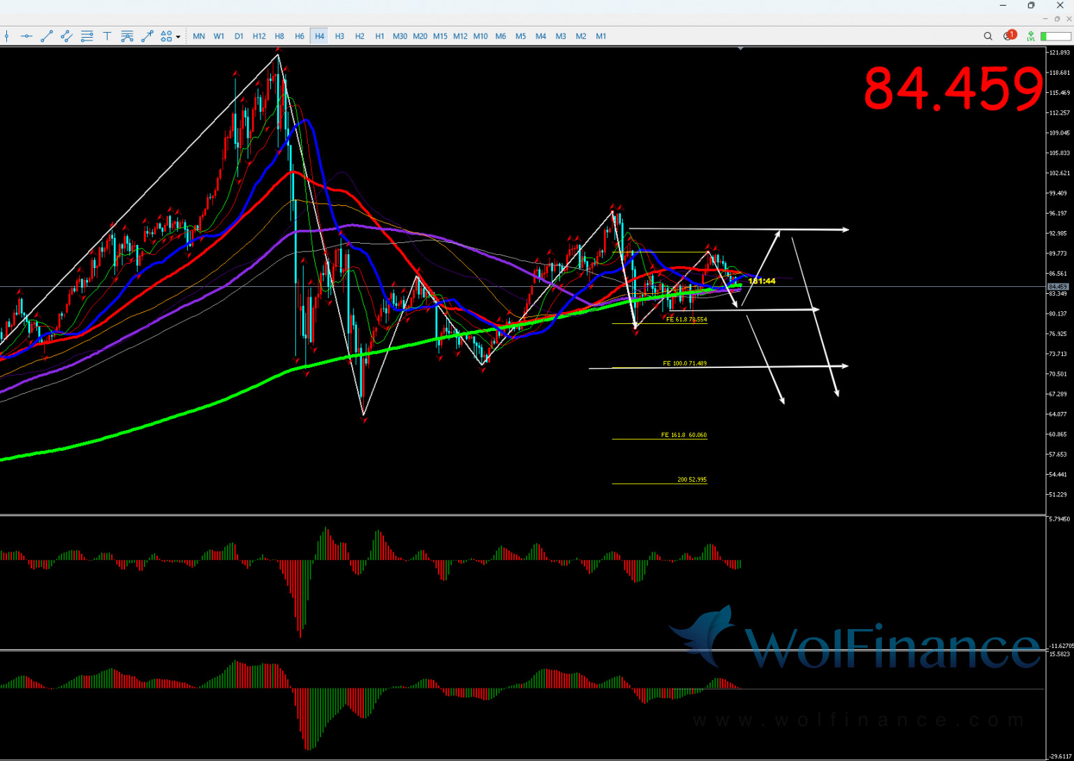 解析:日线AO红色,AC绿色,日线鳄鱼线缠绕;4小时AO红色,AC红色,鳄鱼线缠绕向上;银价目前处于118.37-63.83之间震荡,银价自63.83反弹至96.08后回落,从浪形上看当下处于2小时118.37-63.83下跌段的反弹修正浪中,63.83-96.08为反弹A浪,当下为下跌B浪中,银价当下为71.83-96.08上涨段的修正浪中,96.08跌至77.84下跌段为30分钟修正A-3浪,当下处于A-4中银价在86.77-80.44之间收敛震荡或者是完成了4浪中的ab浪当下形成4-c浪预期,上周五银价反弹至1小时的120均线和89均线下方后回落至79.60后再次反弹,银价反弹站上1小时和4小时的60均线,银价在82.77-85.11之间形成混沌上破后上破银价涨至89.98后高位震荡目前跌破30分钟的60均线跌至6小时的120均线附近,日内下方继续关注82.48-77.84支撑预期,若下不去则则2小时的B-c浪预期上方关注90.00-91.99-99.50区间压力后看4小时的下跌预期;若下去了则看4小时恢复下跌C-3浪预期下方关注目前处于20分钟的下跌主浪中下方关注71.45-63.83-59.89目标预期。